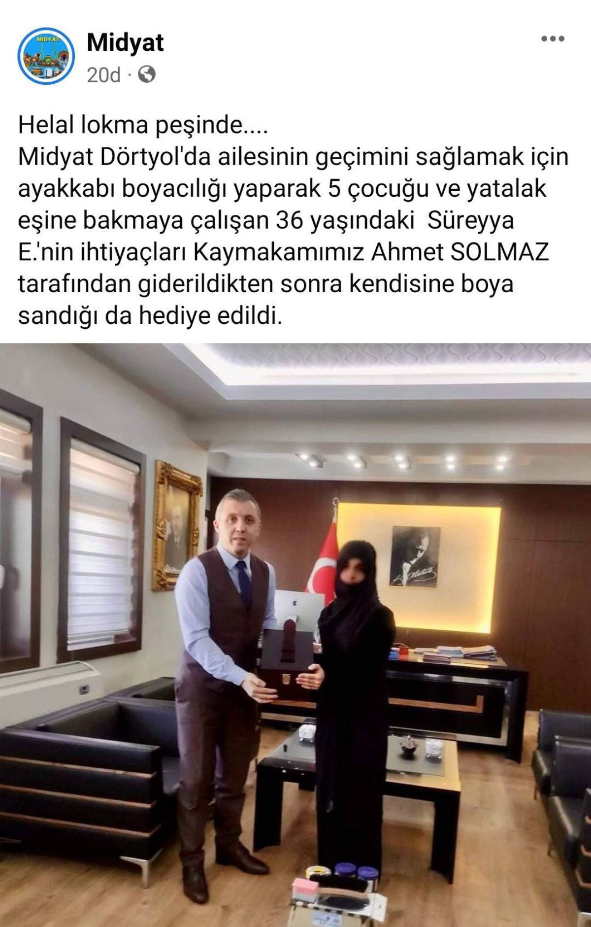 Paylaşımda "Helal lokma peşinde. Midyat Dörtyol'da ailesinin geçimini sağlamak için ayakkabı boyacılığı yaparak 5 çocuğuna bakmaya çalışan 36 yaşındaki Süreyya E.'nin ihtiyaçları Kaymakamımız Ahmet SOLMAZ tarafından giderildikten sonra kendisine boya sandığı da hediye edildi" denildi.