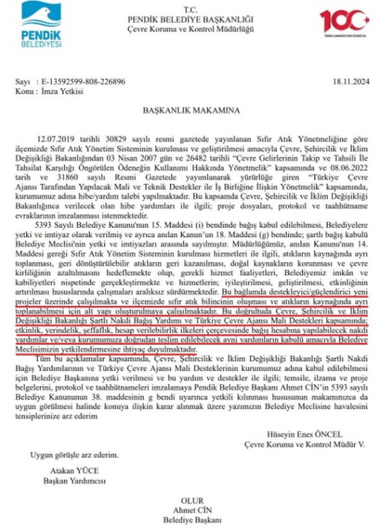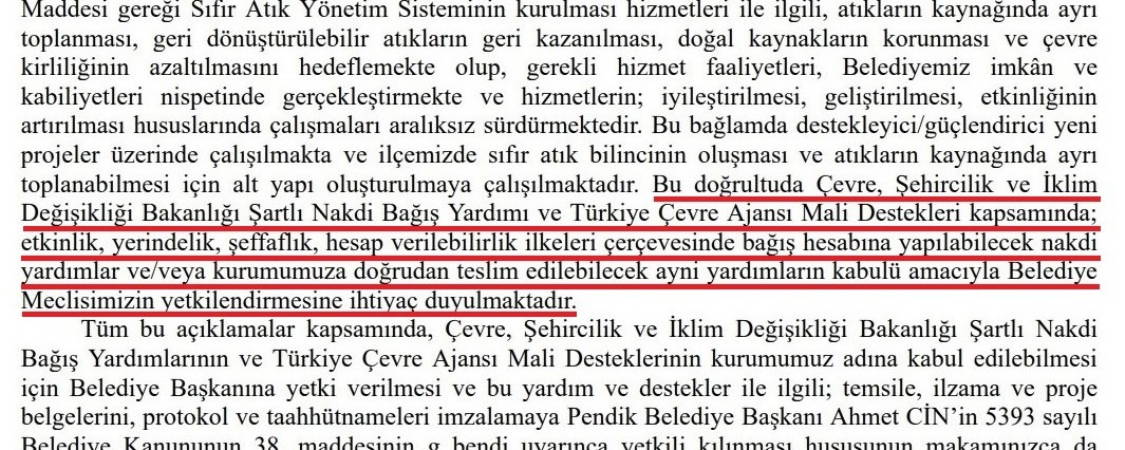 Söz konusu teklifin ilgili bölümünde, “İlçemizde sıfır atık bilincinin oluşması ve atıkların kaynağında ayrı toplanabilmesi için alt yapı oluşturulmaya çalışılmaktadır. Bu doğrultuda Çevre, Şehircilik ve İklim Değişikliği Bakanlığı Şartlı Nakdi Bağış Yardımı ve Türkiye Çevre Ajansı Mali Destekleri kapsamında; etkinlik, yerindelik, şeffaflık, hesap verilebilirlik ilkeleri çerçevesinde bağış hesabına yapılabilecek nakdi yardımlar ve/veya kurumumuza doğrudan teslim edilebilecek ayni yardımların kabulü amacıyla Belediye Meclisimizin yetkilendirmesine ihtiyaç duyulmaktadır. Tüm bu açıklamalar kapsamında, Çevre, Şehircilik ve İklim Değişikliği Bakanlığı Şartlı Nakdi Bağış Yardımlarının ve Türkiye Çevre Ajansı Mali Desteklerinin kurumumuz adına kabul edilebilmesi için Belediye Başkanına yetki verilmesi ve bu yardım ve destekler ile ilgili; temsile, ilzama ve proje belgelerini, protokol ve taahhütnameleri imzalamaya Pendik Belediye Başkanı Ahmet Cin’in yetkili kılınması hususunun…” dendi.