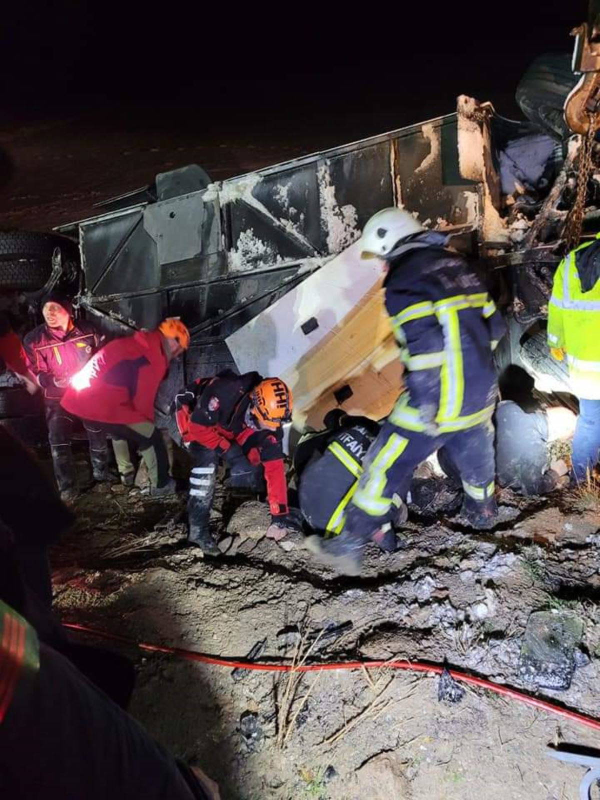 Karşı şeride geçen otobüs, bariyerleri devirerek şarampole yuvarlandı. Kaza ihbarıyla bölgeye AFAD, itfaiye, sağlık, jandarma ve polis ekipleri sevk edildi. Güvenlik güçleri, yolda önlem alarak trafiği kontrollü sağladı.