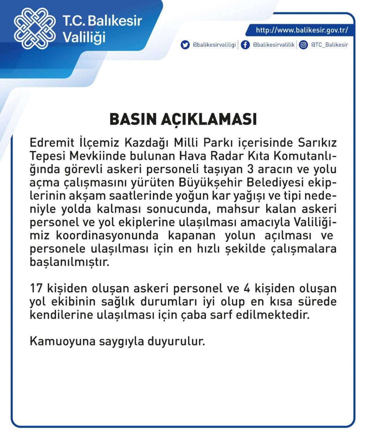 Konuyla ilgili olarak Balıkesir Valiliği'nden yapılan açıklamada, "Edremit ilçemiz Kazdağı Milli Parkı içerisinde Sarıkız Tepesi mevkiinde bulunan Hava Radar Komutanlığında görevli askeri personeli taşıyan 3 aracın ve yolu açma çalışması yürüten Büyükşehir Belediyesi ekiplerinin akşam saatlerinde yoğun kar yağışı ve tipi nedeniyle yolda kalması sonucunda, mahsur kalan askeri personel ve yol ekiplerine ulaşılması amacıyla valiliğimiz koordinasyonunda kapanan yolun açılması ve personellere ulaşılması için en hızlı şekilde çalışmalara başlanılmıştır. 17 kişiden oluşan askeri personel ve 4 kişiden oluşan yol ekibinin sağlık durumları iyi olup en kısa sürede kendilerine ulaşılması için çaba sarf edilmektedir. Kamuoyuna duyurulur" denildi.