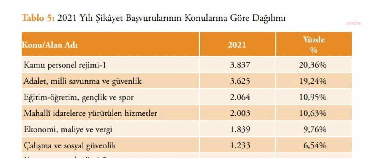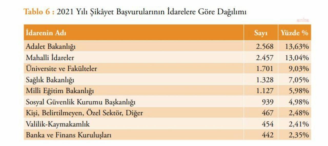 Rapora göre; geçen yıl yurttaşlar toplam 18 bin 843 başvuru yaptı ve yapılan başvurularda en çok Adalet Bakanlığı uygulamalarından şikayet edildi. Adalet Bakanlığı uygulamaları hakkında 2 bin 568 şikayet yapılırken onu 2 bin 457 şikayetle mahalli idareler, bin 701 şikayet ile üniversite ve fakülteler, bin 328 şikayet ile Sağlık Bakanlığı, bin 127 şikayet ile Milli Eğitim Bakanlığı ve 939 şikayet ile Sosyal Güvenlik Kurumu izledi.
