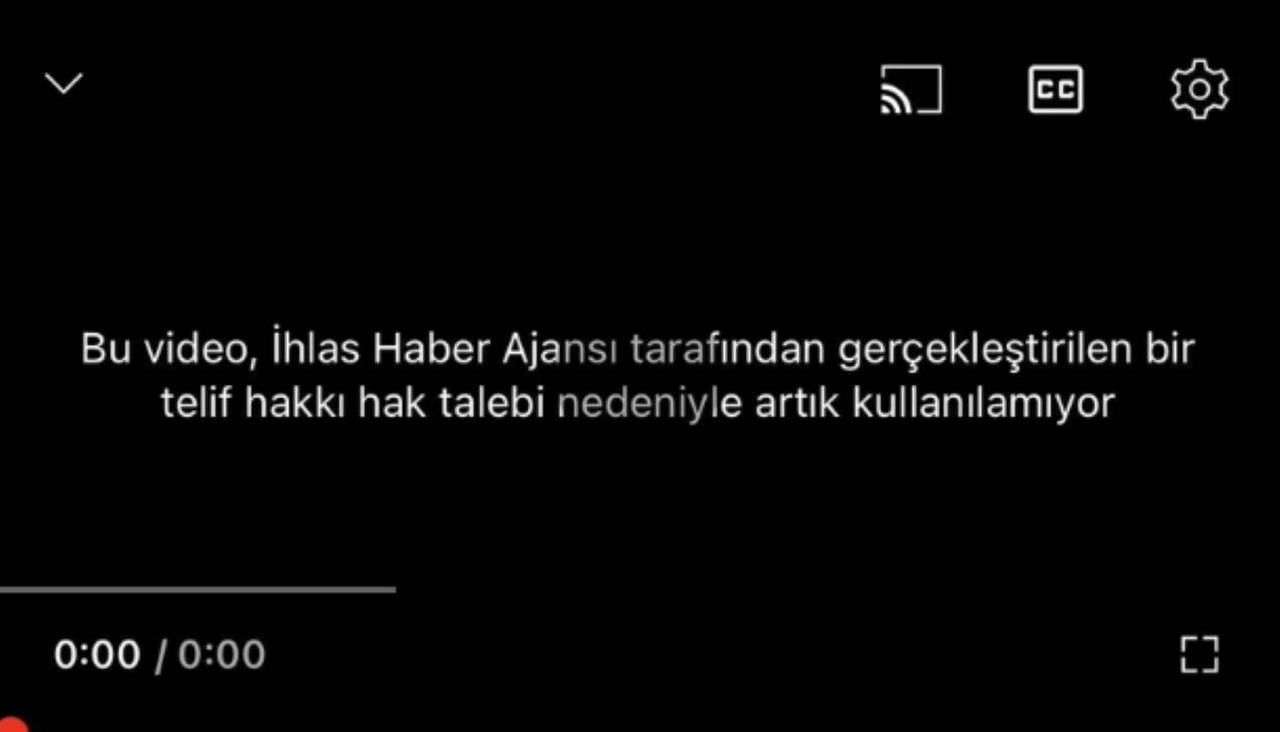 Belgeseli izlemek isteyenler önce, "Bu video, İhlas Haber Ajansı tarafından gerçekleştirilen bir telif hakkı hak talebi nedeniyle artık kullanılamıyor" yazısıyla karşılaştı.