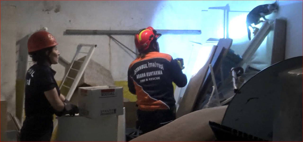 Aynı zamanda otopark olarak da kullanılan bodrum katına inen itfaiye erleri, buradaki eşyaların arasına saklanan kediyi yakalamaya çalıştı.