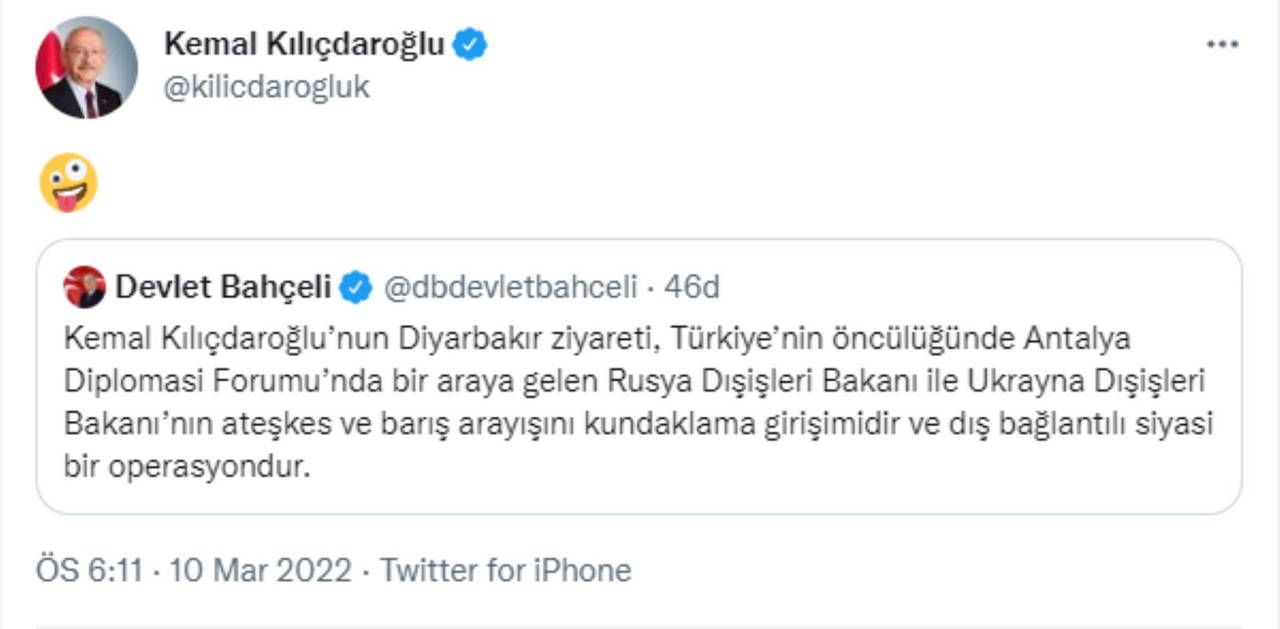 CHP lideri Kılıçdaroğlu ise MHP liderine Twitter hesabı üzerinden 'emoji' ile yanıt verdi.