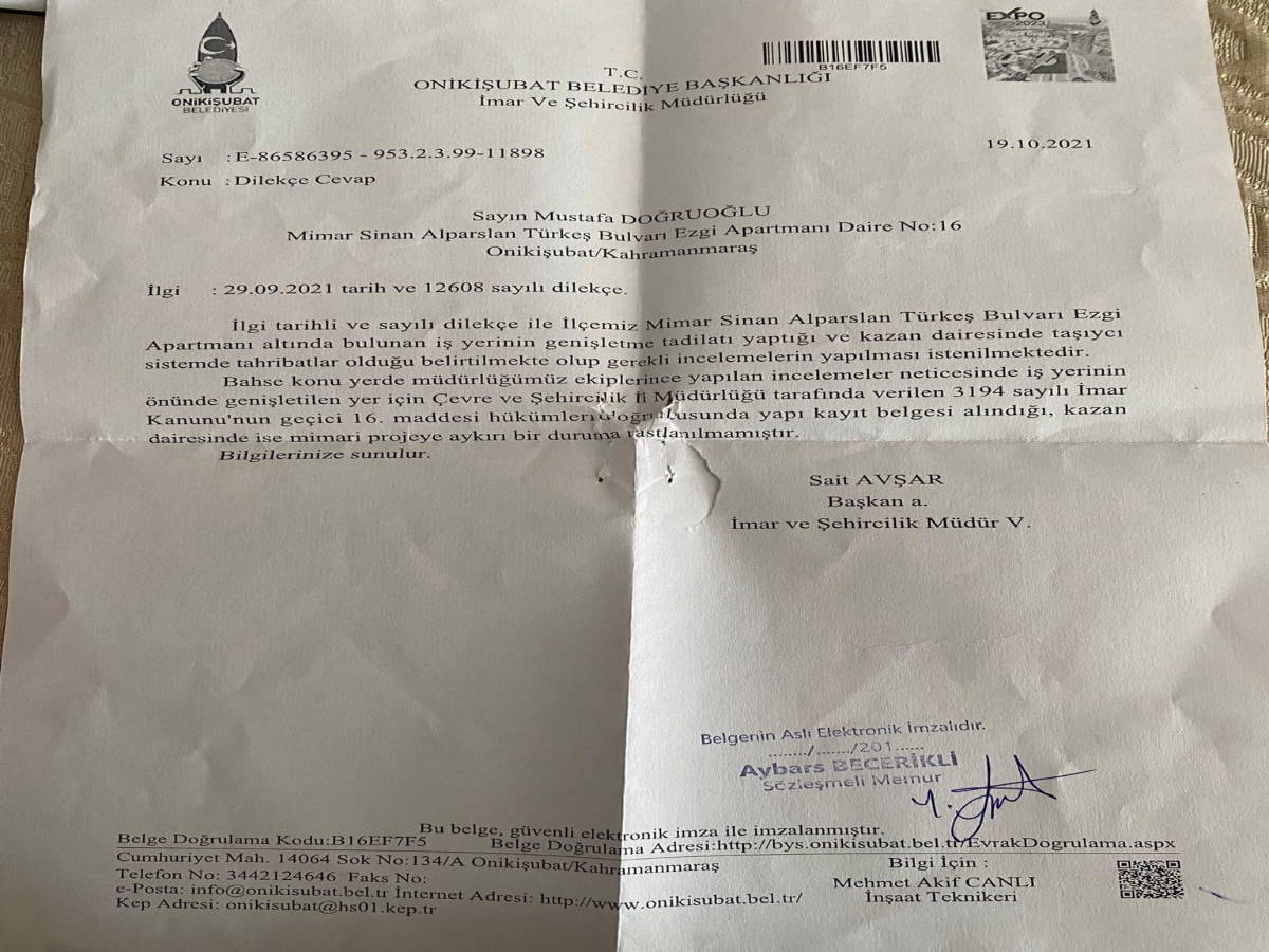 ‘’Bahse konu yerde müdürlüğümüz ekiplerince yapılan incelemeler neticesinde iş yerinin önünde genişletilen yer için Çevre ve Şehircilik İl Müdürlüğü tarafından verilen 3194 sayılı İmar Kanunu’nun geçici 16.maddesi kapsamında yapı kayıt belgesi alındığı, kazan dairesinde ise mimari projeye aykırı bir duruma rastlanmamıştır.‘’