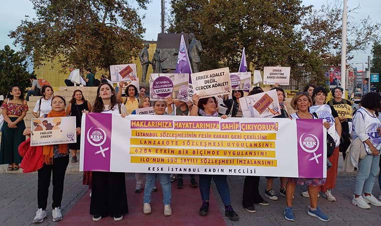 “Erkek şiddet bu kadar açıkken ve kadın cinayetleri ve çocuk istismarı vakaları bu kadar yaygınken asıl sorular sorulmasın, asıl sorun gözlerden uzak tutulsun, asıl sorumlulardan hesap sorulmasın diye de ilgi başka yerlere çekilmeye çalışan AKP-MHP iktidarıysa eril şiddete son verme iradesi göstermiyor. İşte tüm bu nedenlerle kadın cinayetleri politik. 6284 Sayılı Kanun kadın mücadelesinin bir kazanımıdır, etkin uygulansın. İstanbul Sözleşmesi’nden çıkılması, 6284’te yaptığınız her değişiklik kadınların, çocukların hayatına mal oluyor. Öldürülen kadınların hemen hepsi daha önce şikâyette bulunmuş oluyor, 6284’ü uygulasaydınız, kadının beyanı esas alınsaydı bunca kadın ölmeyecekti. Kadın cinayetleri, kadına yönelik şiddet önlenebilir. İstanbul Sözleşmesi’nin fesih kararı geri çekilsin. Lanzarote Sözleşmesi Uygulansın. 6284 etkin bir biçimde uygulansın. ILO’nun 190 Sayılı Sözleşmesi imzalansın”
