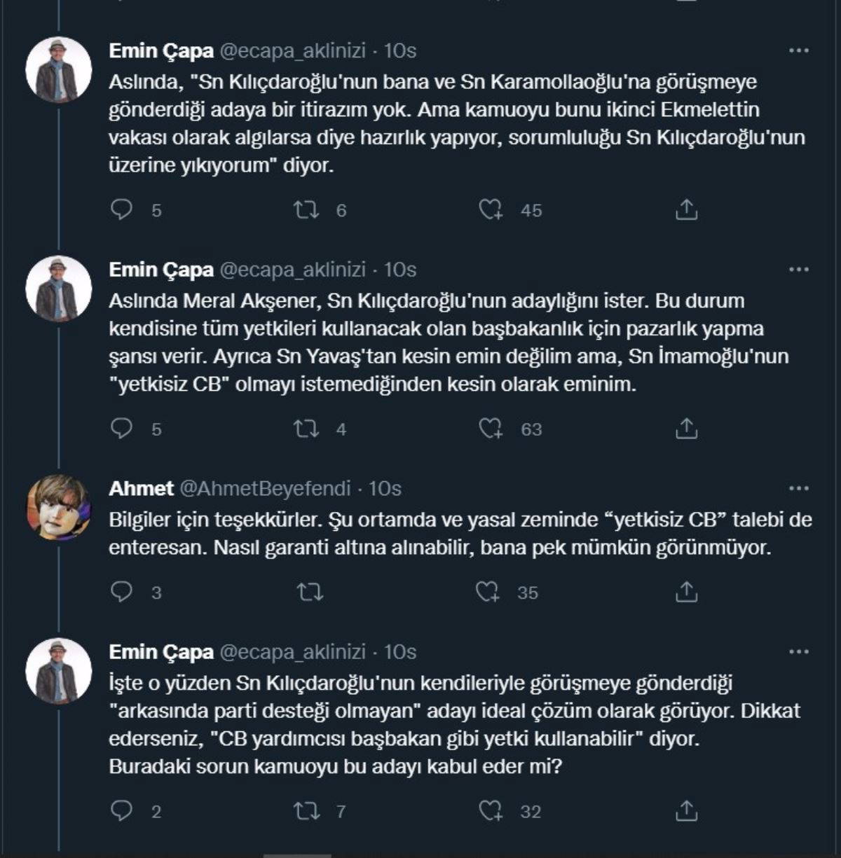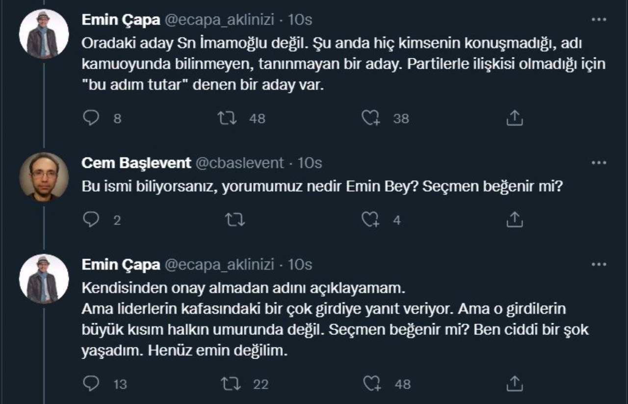 Emin Çapa, sosyal medya hesabından yaptığı açıklamalarda Kılıçdaroğlu ile olduğunu söylediği bir görüşmeyi aktardı. Kılıçdaroğlu'nun cumhurbaşkanlığı adaylığı için görüştüğü kişinin 'liderlerin kafasındaki birçok girdiye yanıt verdiğini' iddia eden Çapa, o kişinin İBB Başkanı Ekrem İmamoğlu olmadığını söyledi.