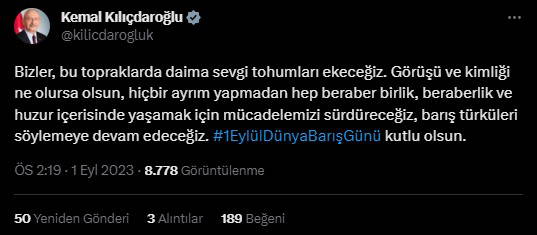 "Bizler, bu topraklarda daima sevgi tohumları ekeceğiz" diyen Kılıçdaroğlu, "Görüşü ve kimliği ne olursa olsun, hiçbir ayrım yapmadan hep beraber birlik, beraberlik ve huzur içerisinde yaşamak için mücadelemizi sürdüreceğiz, barış türküleri söylemeye devam edeceğiz. 1 Eylül Dünya Barış Günü kutlu olsun" ifadelerini kullandı.