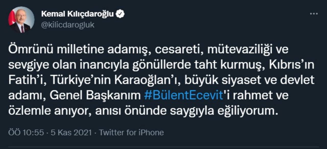 "Ömrünü milletine adamış, cesareti, mütevaziliği ve sevgiye olan inancıyla gönüllerde taht kurmuş, Kıbrıs’ın Fatih’i, Türkiye’nin Karaoğlan’ı, büyük siyaset ve devlet adamı, Genel Başkanım Bülent Ecevit'i rahmet ve özlemle anıyor, anısı önünde saygıyla eğiliyorum.”