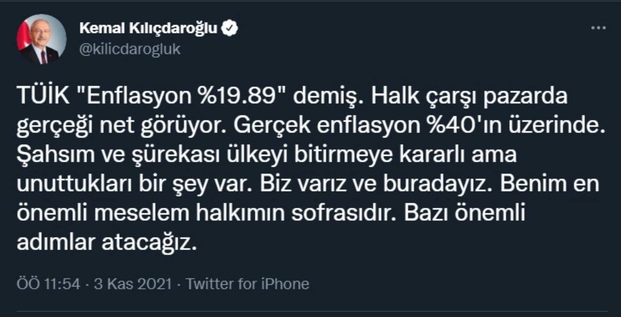 Konuya ilişkin sosyal medya hesabından bir mesaj yayımlayan Kemal Kılıçdaroğlu, TÜİK'in açıkladığı orana tepki göstererek, "Gerçek enflasyon yüzde 40'ın üzerinde" dedi.