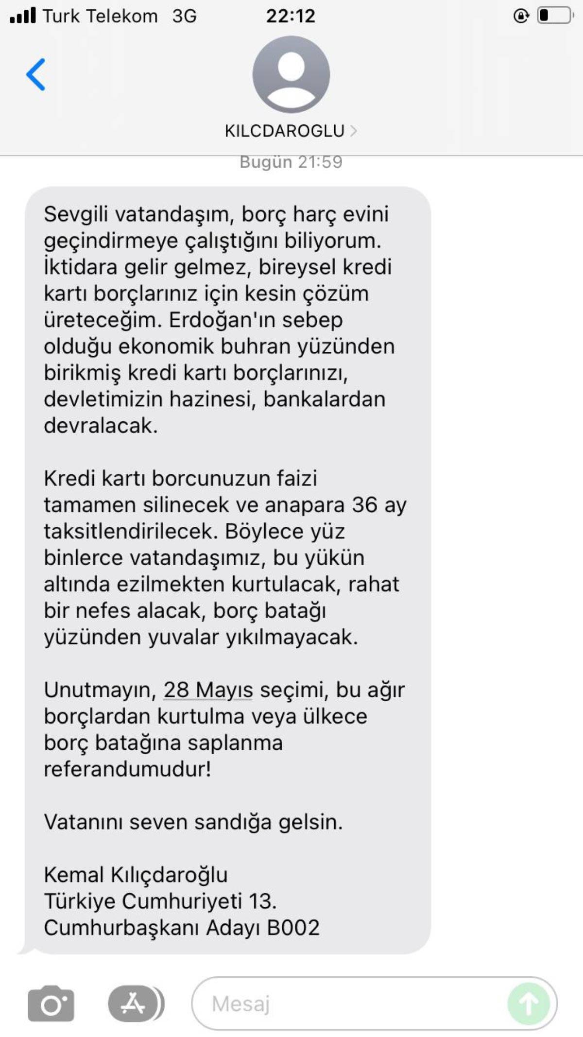 28 Mayıs'taki 2'nci tur seçimlerine kısa bir süre kala Millet İttifakı Cumhurbaşkanı adayı ve CHP Genel Başkanı Kemal Kılıçdaroğlu, yurttaşların cep telefonlarına biriken kredi kartı borçları hakkında bir kısa mesaj gönderdi.