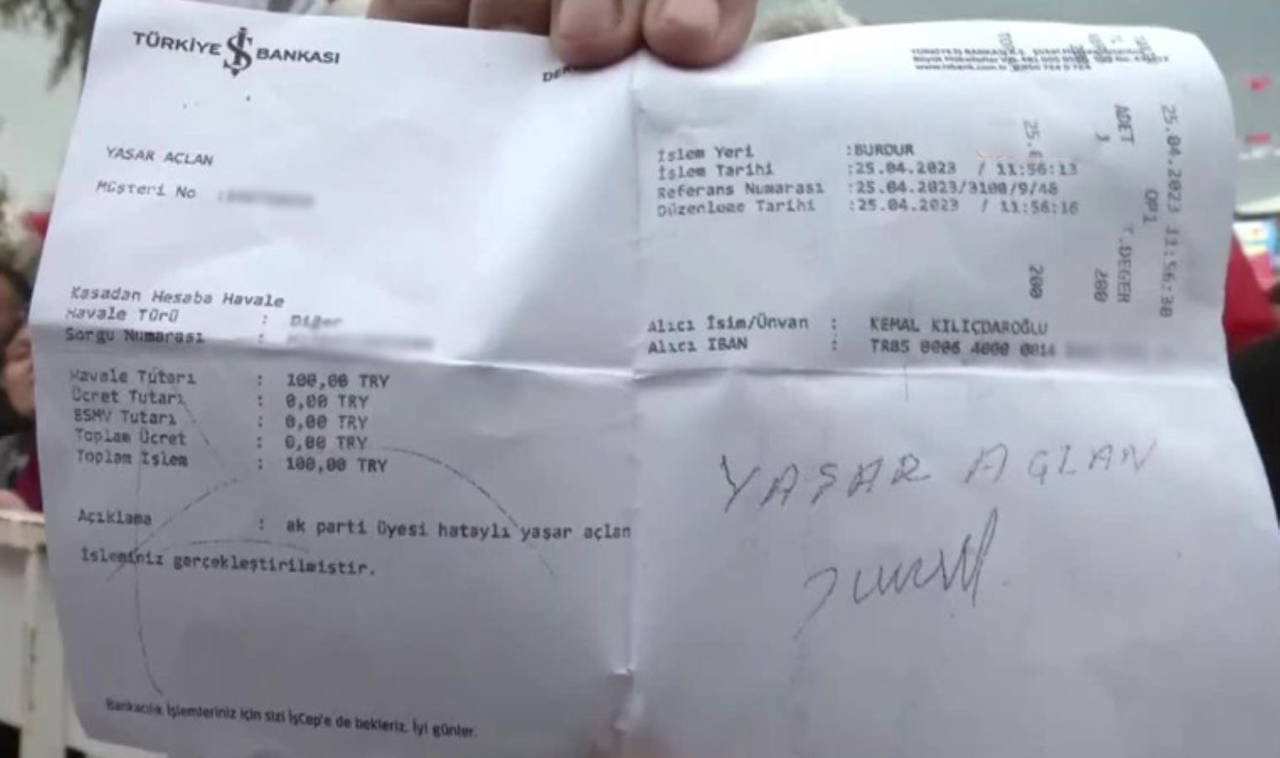 Hatay’dan gelen Yaşar Açlan isimli yurttaş, Kılıçdaroğlu’nun Cumhurbaşkanı adaylığı kampanyasına 100 TL bağış yaptı. Açlan’ın gösterdiği banka dekontunun açıklama bölümünde “AK Parti üyesi Hataylı Yaşar Açlan” ifadelerinin yazılı olduğu görüldü. Açlan, eskiden MHP’li olduğunu ve daha sonra AKP’ye oy verdiğini aktararak, ekonomik koşullar nedeniyle bu seçimde CHP’yi destekleyeceğini şöyle anlattı: