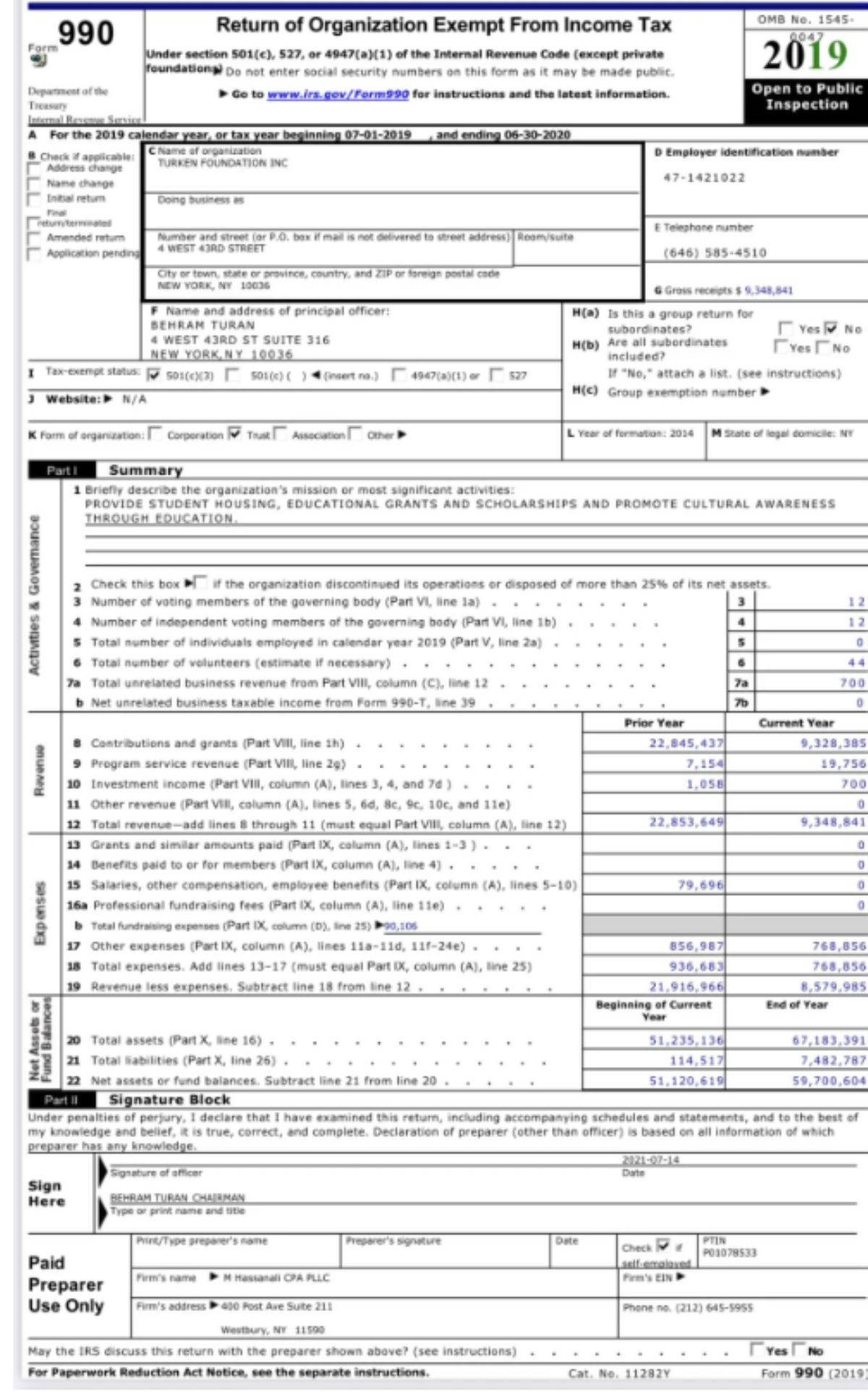 CHP'nin ABD Temsilciliği tarafından yapılan açıklamada TURKEN Foundation'un vergi beyannamesine ulaşıldığı belirtilerek "ABD Gelir Dairesi’nden (IRS) aldığımız bu resmi beyanname 1 Temmuz 2019 ve 30 Haziran 2020 arası tarihleri kapsıyor. Sadece o sene TURKEN Foundation’a 9.3 milyon dolar bağış gelmiş" bilgisi verilmişti.
