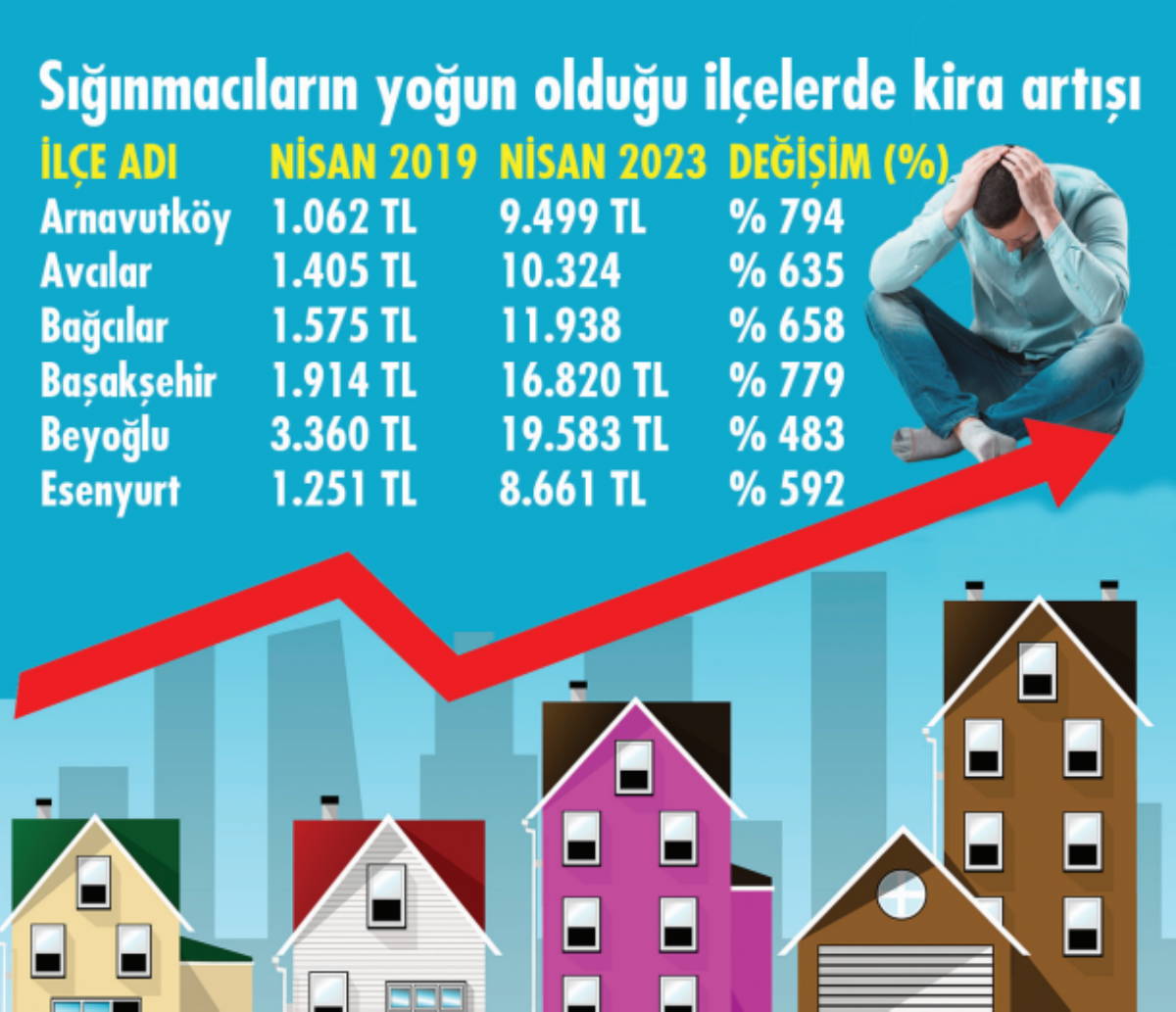 Bir emlak sitesinin verilerine göre İstanbul’da sığınmacıların yoğun olarak yaşadığı ilçelerde beş yıllık kira değişimi karşılaştırıldı. Nisan 2019 ile Nisan 2023 kira fiyatları karşılaştırıldığında en yüksek artış yüzde 807 ile Kâğıthane’de yaşandı. Kâğıthane’yi yüzde 794 ile Arnavutköy, yüzde 779 ile Başakşehir ve yüzde 777 ile Gaziosmanpaşa takip ediyor. Sığınmacıların yoğun yaşadığı ilçelerde ise Nisan 2019’da bin-3 bin TL bandında olan kiraların bugün 8 bin TL-19 bin TL bandında olduğu görüldü.
