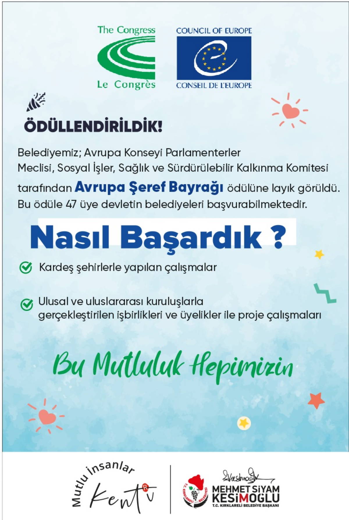 Avrupa Şeref Bayrağı’nı kazanmış olmanın, sadece kent genelinde değil, bölge ve ülke genelinde de önemli bir kilometre taşı olduğunu ifade eden Kırklareli Belediye Başkanı Mehmet Siyam Kesimoğlu, “Kırklareli Belediyesi olarak, vatandaşlarımızın nitelikli sosyal yapısı ve geleceğe olan geniş bakış açısı, bizleri her daim motive etti. Yaptığımız çalışmalar ve attığımız adımlarla, Kırklareli’yi bir marka haline getirdik ve sınırları aşan bir statüye kavuşturduk. Bunu halkımız ile birlikte başardık. Kırklareli sahip olduğu argümanlar ve potansiyeli ile bugün sadece ülke çapında değil, sınırları aşan bir düzeyde tanınırlığa ulaştı. Avrupa’dan aldığımız ödüller sadece Kırklareli’nin değil, Türkiye’nin edindiği bir kazanımdır” dedi.