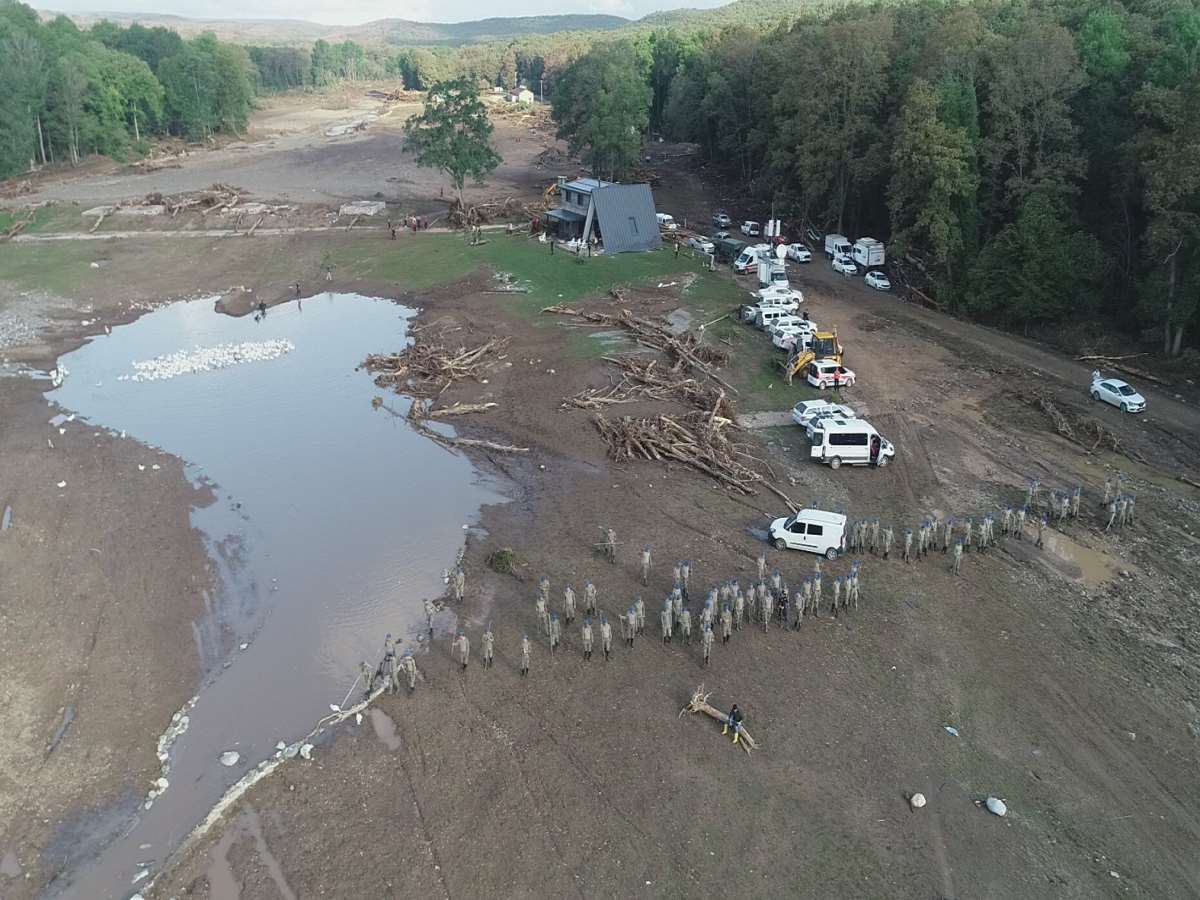 Arama kurtarma çalışmalarına çok sayıda komando birlikleri de katılıyor. Orman köylüsü selin sürüklediği tomruk ve kütüklerin kaldırılması çalışmalarına yardım ediyor. Arama kurtarma köpekleri de bölgede arama çalışmalarına katılıyor.