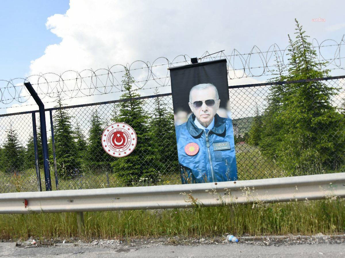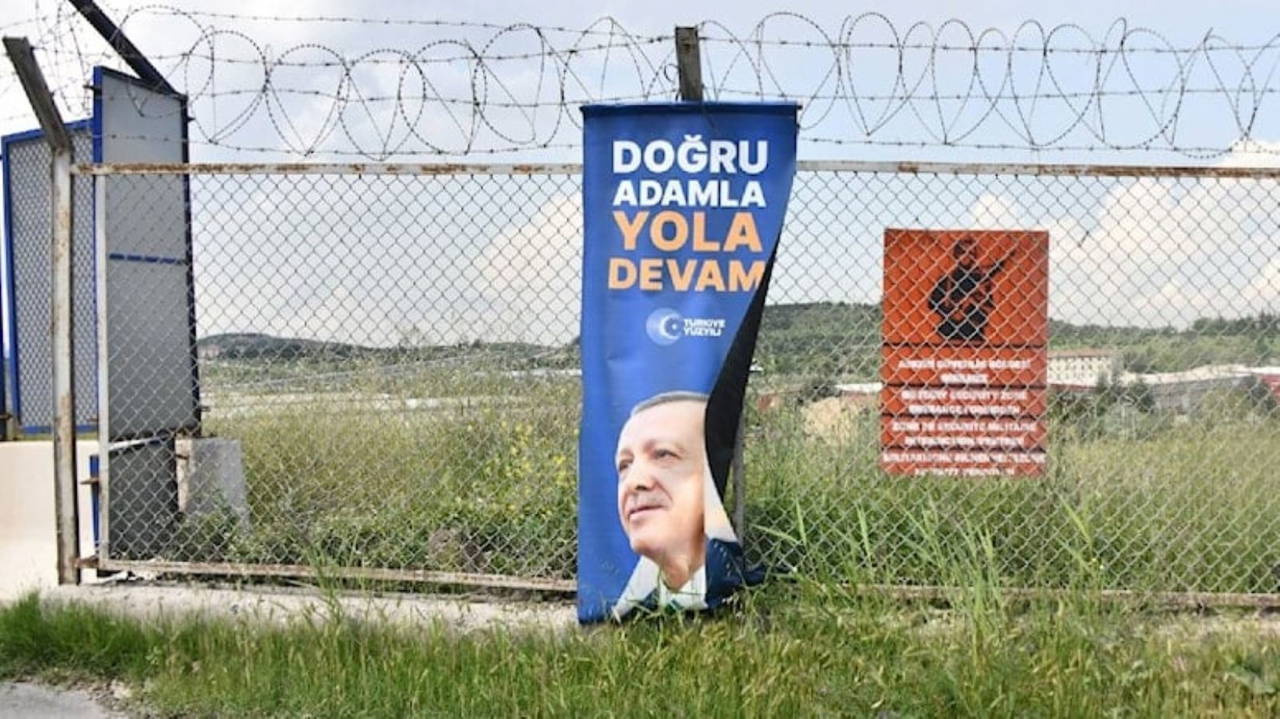Ankara'da Etimesgut Zırhlı Birlikler Okulu’nun tel örgüleri Cumhur İttifakı’nın adayı cumhurbaşkanı ve AKP Genel Başkanı Recep Tayyip Erdoğan'ın posterleri ile donatıldı.