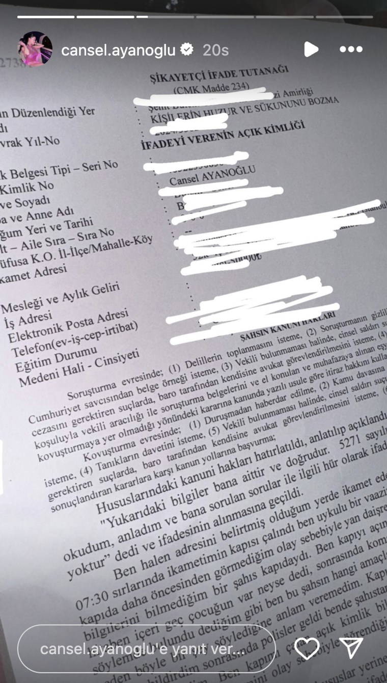 Cansel Ayanoğlu karakolda verdiği şikayetçi ifade tutanağının fotoğrafını da sosyal medya hesabından paylaştı.