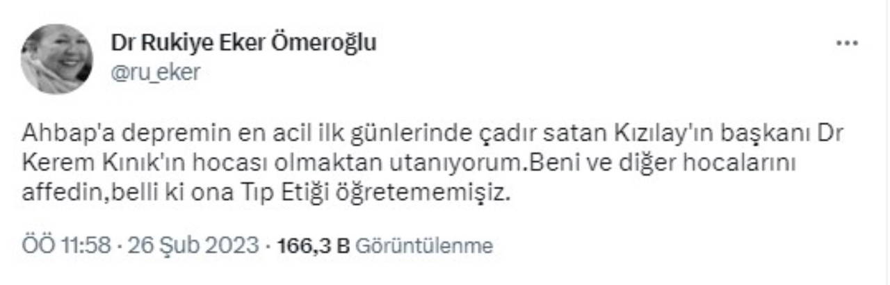 "Ahbap'a depremin en acil ilk günlerinde çadır satan Kızılay'ın başkanı Dr Kerem Kınık'ın hocası olmaktan utanıyorum. Beni ve diğer hocalarını affedin, belli ki ona Tıp Etiği öğretememişiz."