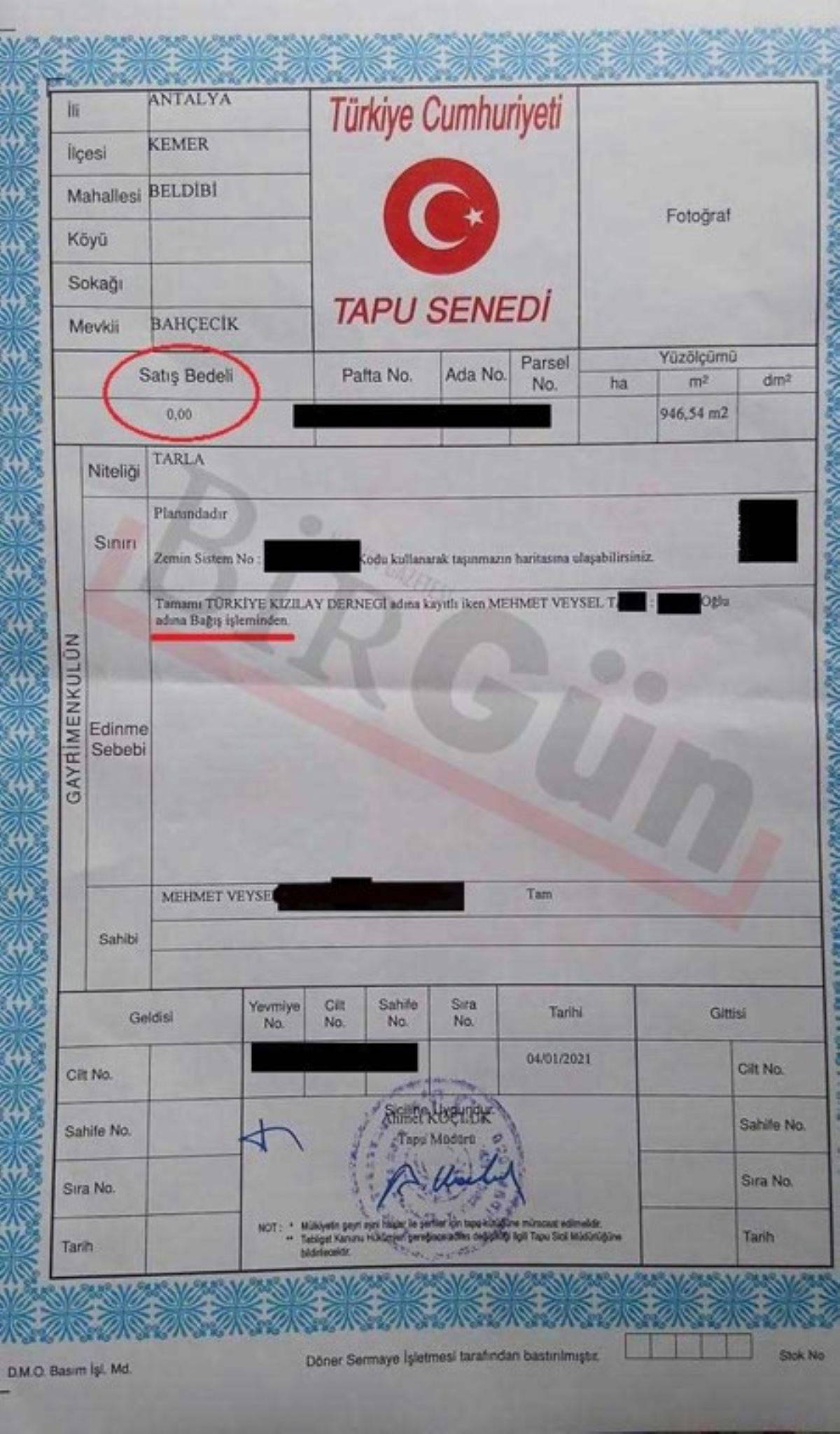 BirGün gazatesinden İsmail Arı’nın haberine göre, Kızılay Antalya Kemer’deki bir arazisini 4 Ocak 2021 tarihinde Mehmet Veysel T. isimli bir şahsa bağışladı. Söz konusu işlem tapu kayıtlarına “Tamamı Türkiye Kızılay Derneği adına kayıtlı olan arsa Mehmet Veysel T.’ye bağışlandı” ifadeleriyle işlendi.
