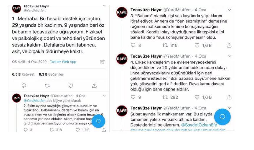 Bu süreçte ailesi ve çevresinin yalnız bırakıp, şikayetini geri çekmesi konusunda baskı yaptığı D.A., ilk duruşma öncesi sosyal medya aracılığıyla destek istedi. Twitter'da 'Tecavüze hayır' başlığıyla hesap açan D.A., yaşadıklarını anlatarak, "9 yaşından beri öz babamın tecavüzüne uğruyorum. Fiziksel ve psikolojik şiddeti ve tehditleri yüzünden sessiz kaldım. Defalarca beni tabanca, asit ve bıçakla öldürmeye kalktı. Babaannem, dedem ve benim için en acısı annem ve kardeşlerim olmak üzere tecavüzcü babamın yanında oldular" ifadelerini kullandı.