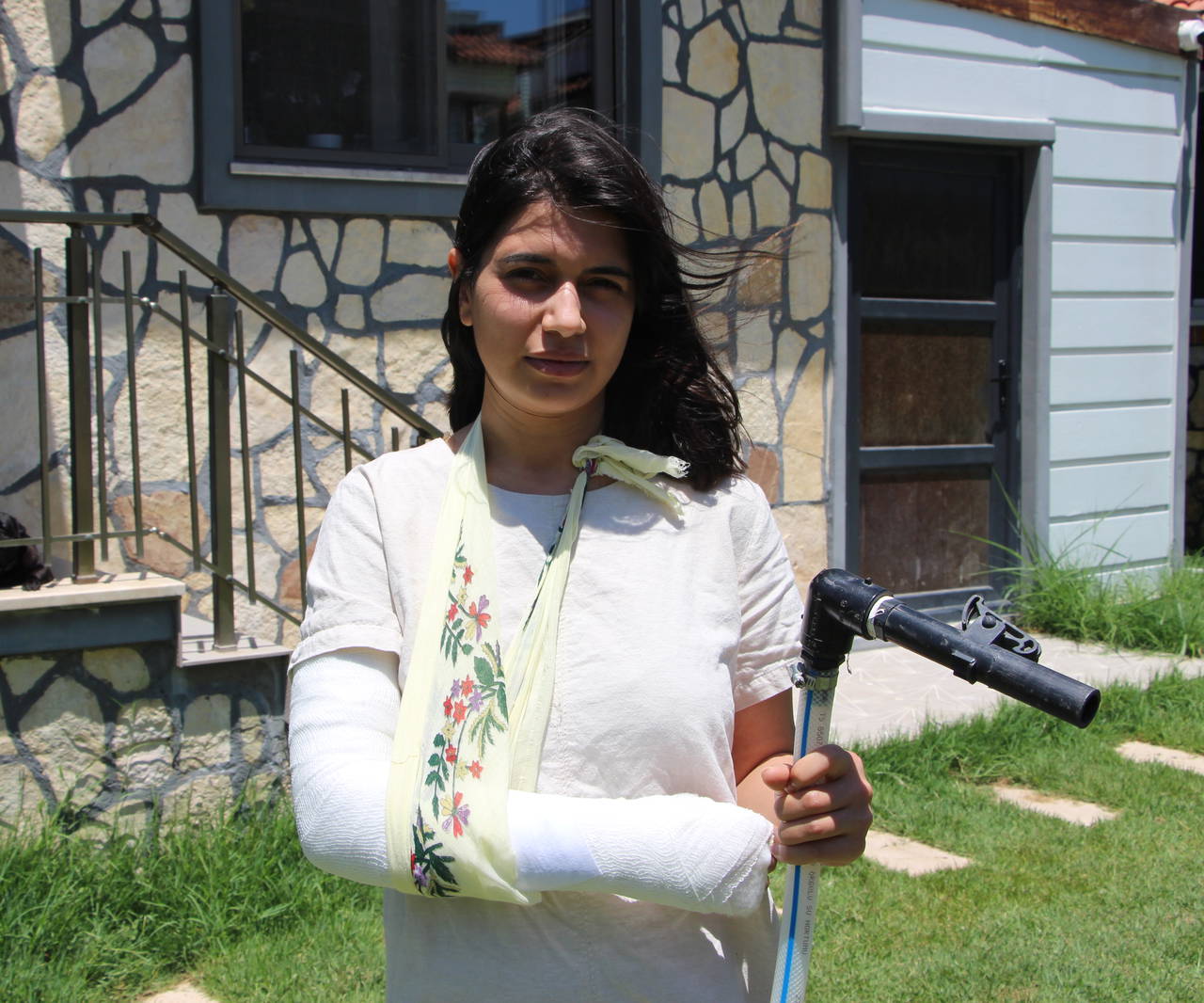 "Alkollüydü önce babama sonra bana hortum ile saldırdı. Koluma iki defa vurdu. 'Dur, yapma' dememe rağmen iki defa da kafama hortumla vurdu. Kendisi ve oğlu darbetti. Babama oğluyla birkaç defa vurdu. Komşular, babamı bahçeden balkona almasına rağmen yine saldırdı. Babam darbetmedi, küfretti. Onlar bize her şeyi yaptı. Eşinden, kendisinden, oğlundan şikayetçi oldum. Pilotaj eğitimi alıyorum. Kolum kırılsaydı meslek hayatıma mal olacaktı."