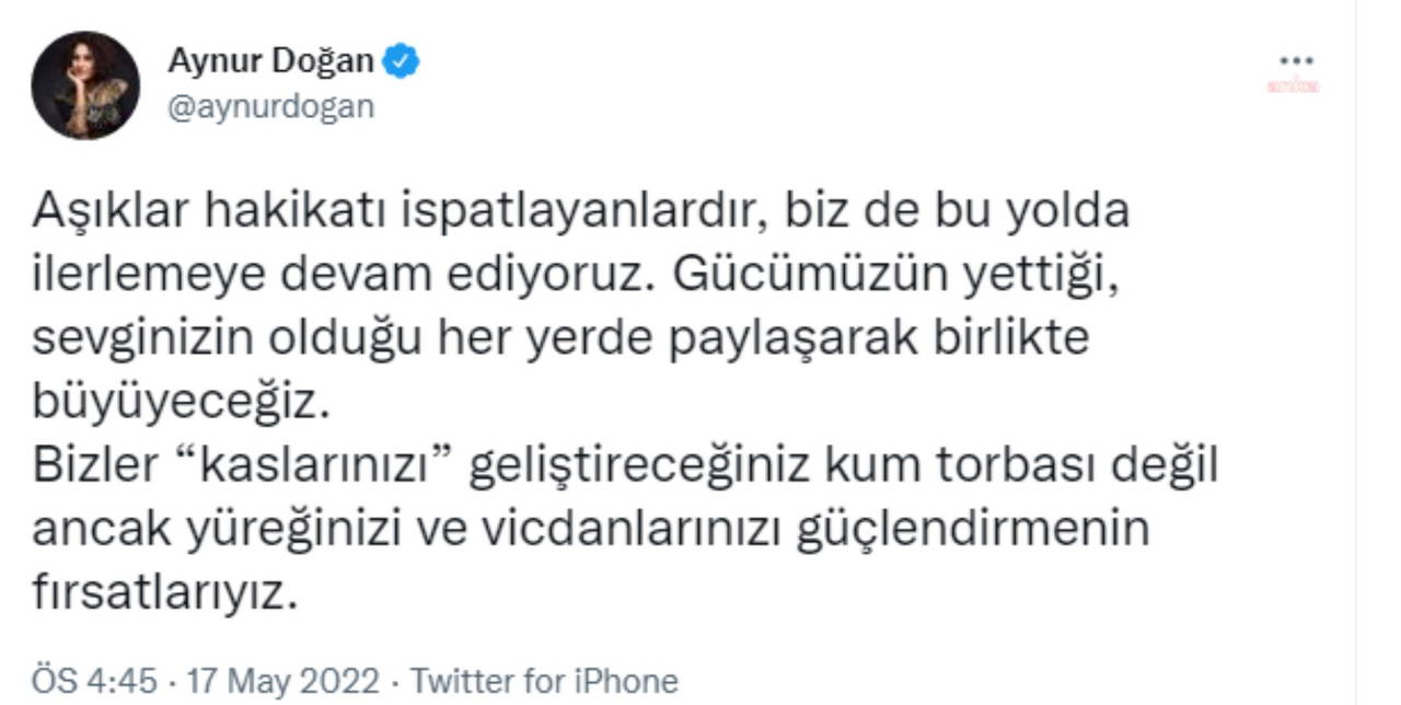 Doğan’a siyasilerden ve sanatçılardan destek mesajları geldi. Doğan ise bugün sosyal medya hesabı üzerinden, “Aşıklar hakikati ispatlayanlardır, biz de bu yolda ilerlemeye devam ediyoruz. Gücümüzün yettiği, sevginizin olduğu her yerde paylaşarak birlikte büyüyeceğiz. Bizler ‘kaslarınızı’ geliştireceğiniz kum torbası değil ancak yüreğinizi ve vicdanlarınızı güçlendirmenin fırsatlarıyız” açıklamasını yaptı.