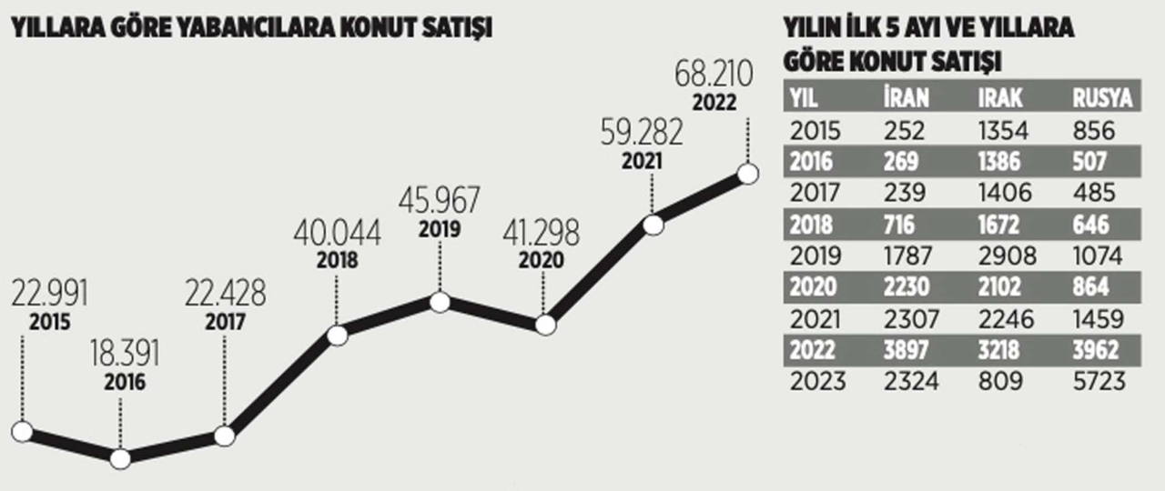 Bir diğer önemli veri ise Ukrayna’nın ilgisi... Önceki yıllarda Türkiye’den konut alma konusunda ilk 20’ye bile zor giren Ukrayna, 2022 yılında başlayan Rusya ile savaşın ardından Türkiye’ye olan ilgisini artırdı. Ukrayna, 2022 yılında 2 bin 574 ile Türkiye’den en çok konut alan 6’ncı ülke oldu. 2023’ün ilk 5 ayında ise 770 ile dördüncü sırada yer aldı.