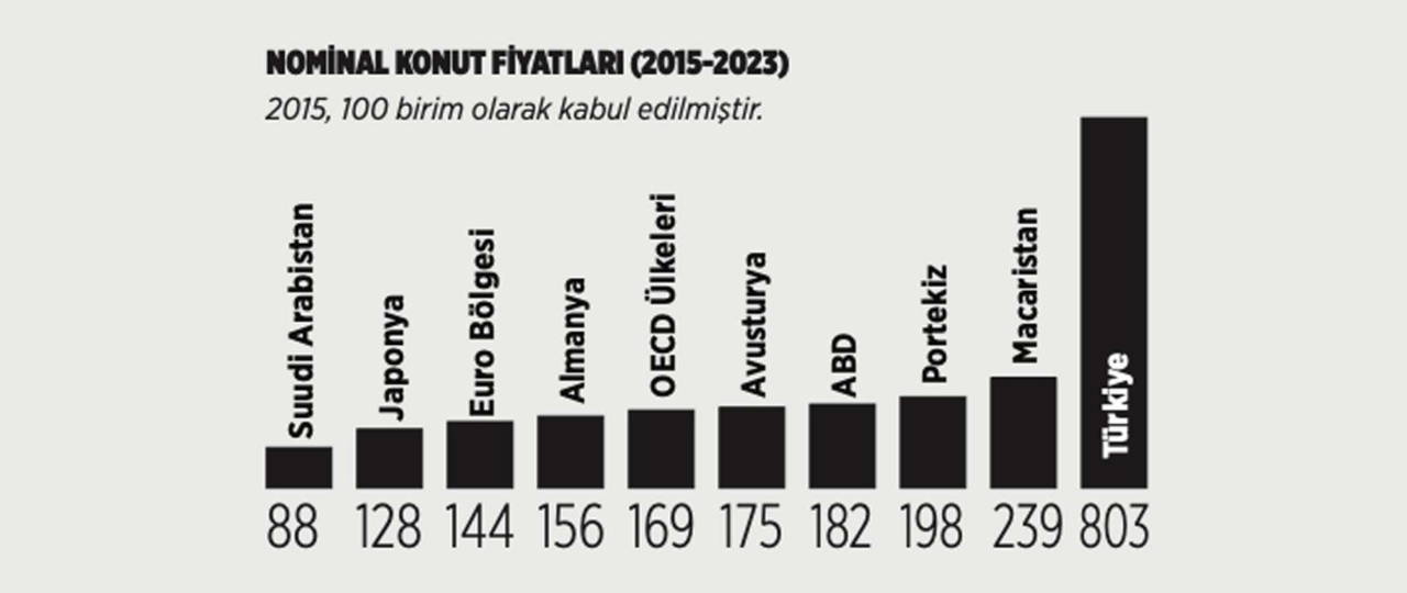 Ekonomik Kalkınma ve İşbirliği Örgütü (OECD) tarafından hazırlanan konut fiyatları istatistiklerine göre, 2015-2023 yılları arasında dünyada konut fiyatları en çok artan ülke, yüzde 703 artışla açık ara farkla Türkiye olarak ölçülüyor. Türkiye’nin en yakın rakibi yüzde 163 artışla Macaristan olurken, OECD ülkelerindeki ortalama artış yüzde 69. Avrupa’da artış oranı ortalama yüzde 44, ABD’de yüzde 82 olarak ölçülüyor.