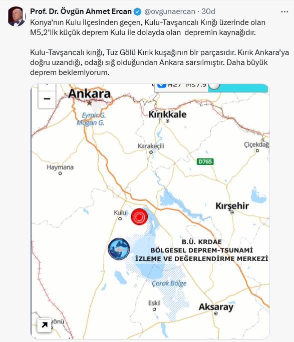 "Konya’nın Kulu ilçesinden geçen, Kulu-Tavşancalı Kırığı üzerinde olan M5,2’lik küçük deprem Kulu ile dolayda olan depremin kaynağıdır.