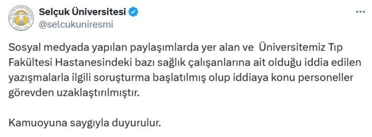 "Sosyal medyada yapılan paylaşımlarda yer alan ve Üniversitemiz Tıp Fakültesi Hastanesindeki bazı sağlık çalışanlarına ait olduğu iddia edilen yazışmalarla ilgili soruşturma başlatılmış olup iddiaya konu personeller görevden uzaklaştırılmıştır."