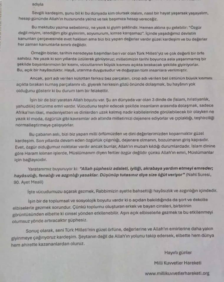 Söz konusu bildiride, dışarıda ‘açık’ giyinerek gezmenin günah olduğu ve ‘açık’ giyinmenin Afrika'nın ilkel kabilelerine özgü bir davranış olduğu savunularak, kapanmaları gerektiği yönünde uyarı maiyetinde ifadelere yer verildi.