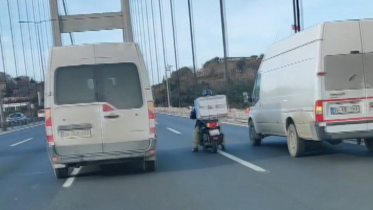 Araçlarıyla lodosa kalkan olan sürücüler motosikletliye köprüden geçişi boyunca eşlik etti. O anlar arkadan gelen bir sürücünün cep telefonu kamerasına yansıdı.