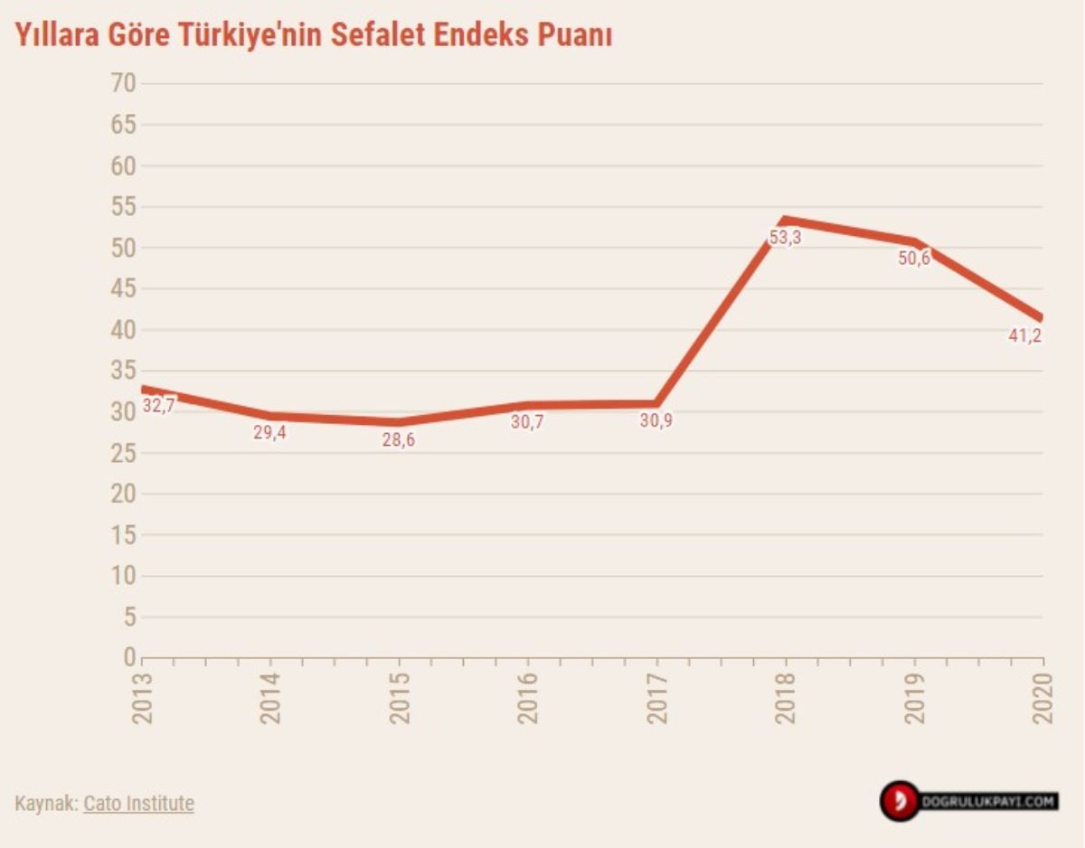 Doğruluk Payı editörü Emincan Yüksel tarafından hazırlanan içerikte, Türkiye'nin Sefalet Endeksi'ndek yeri incelendi. Ortalama bir yurttaşın ekonomik durumunu göstermek için oluşturulan 'Sefalet Endeksi', mevsimsellik etkisi arındırılmış işsizlik oranı ve yıllık enflasyon oranının toplanmasıyla hesaplanıyor.