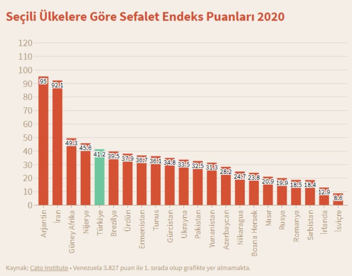2020 yılına gelindiğinde ise Türkiye'nin Dünya Sefalet Endeksi'ndeki puanı 41,2 oldu. Böylece Türkiye, 156 ülke içinde kendini 21. sırada yer buldu. Bu endekste sıralamanın yükselmesi ülkede sefaletin arttığın, ekonomin kötüye gittiğini gösteriyor.