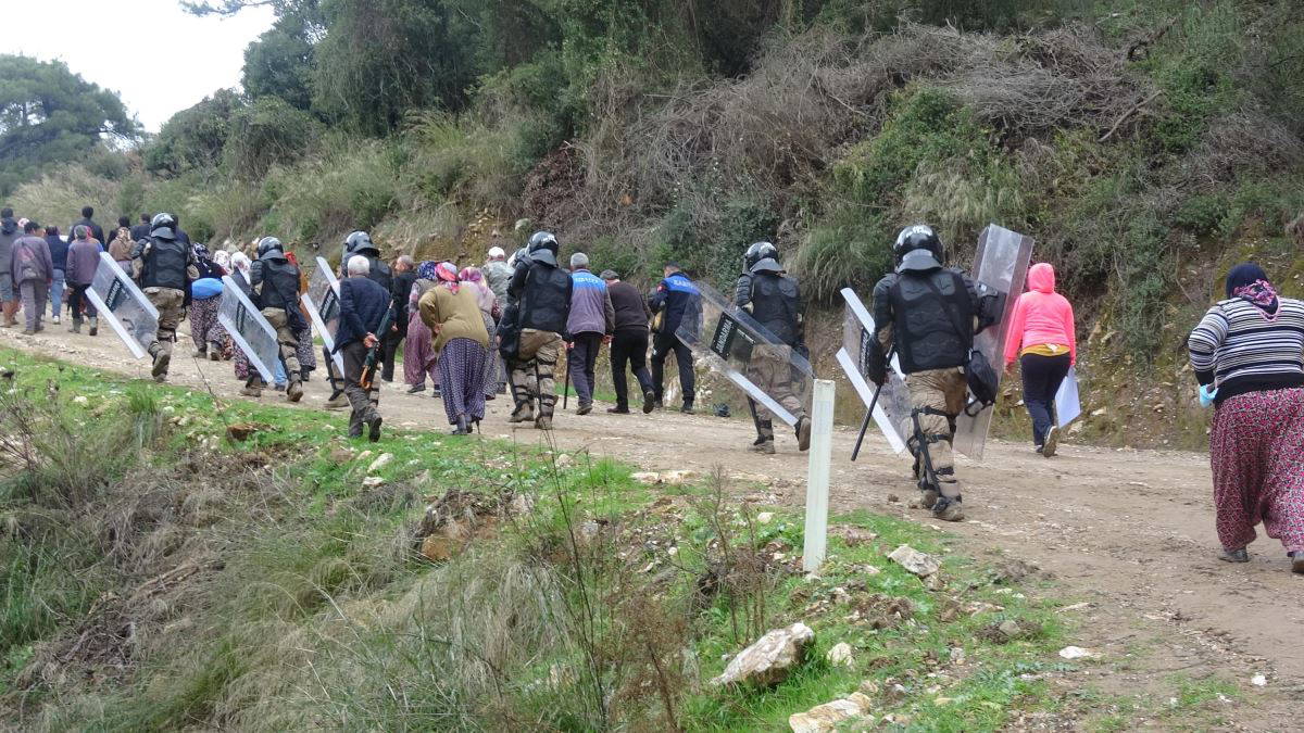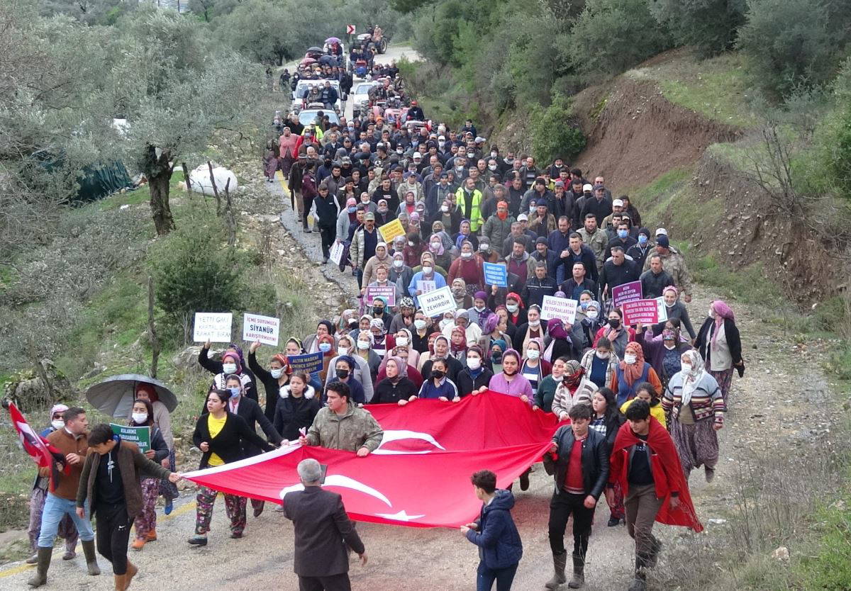 Bugün öğle saatlerinde köy meydanında toplanan yaklaşık bin kişi, ellerinde Türk bayrakları ve 'Bu topraklarda sarı incir kebabı yetişir', 'Bu toprakları 400 yıldır atalarımız işliyor, geçimini sağlıyor', 'İçilesi zeytinyağı bu topraklardan elde edilir' ve 'İçme suyumuza siyanür karıştırmayın' yazılı dövizlerle 1 kilometre mesafedeki etüd çalışması yapılan bölgeye yürüdü. Jandarma ekipleri barikat kurarak eylemcilerin çalışma yapılan alana girmesini engelledi. Kalabalığın ısrarına rağmen jandarma 3 sondaj çalışması yapılan etüd alanına girilmesini izin vermedi.