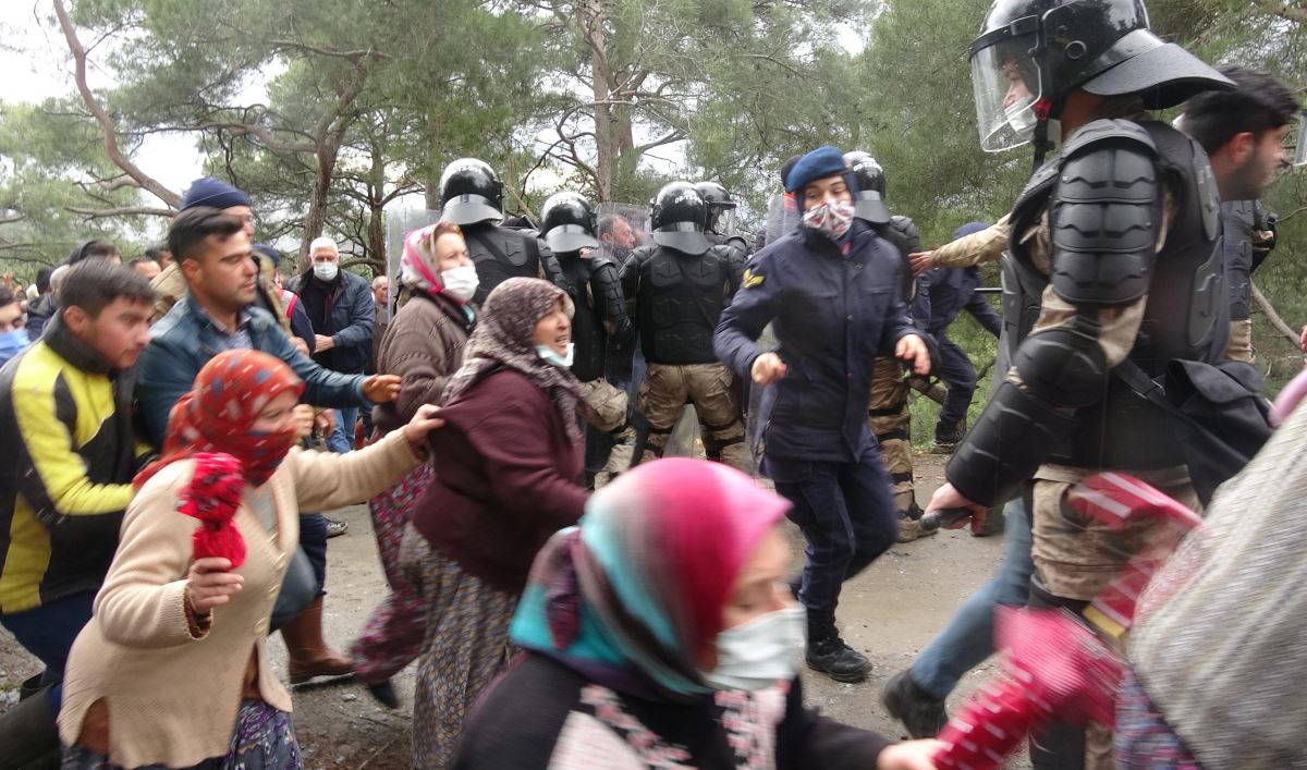 Meydanda toplanıp, çalışmanın yapıldığı alana yürüyen kalabalık, jandarma barikatını aşıp, bir traktör kepçenin lastiklerini kesti. Kalabalığa engel olmak isteyen jandarmalardan bazılarının yaşanan arbede sırasında üniformaları yırtıldı.