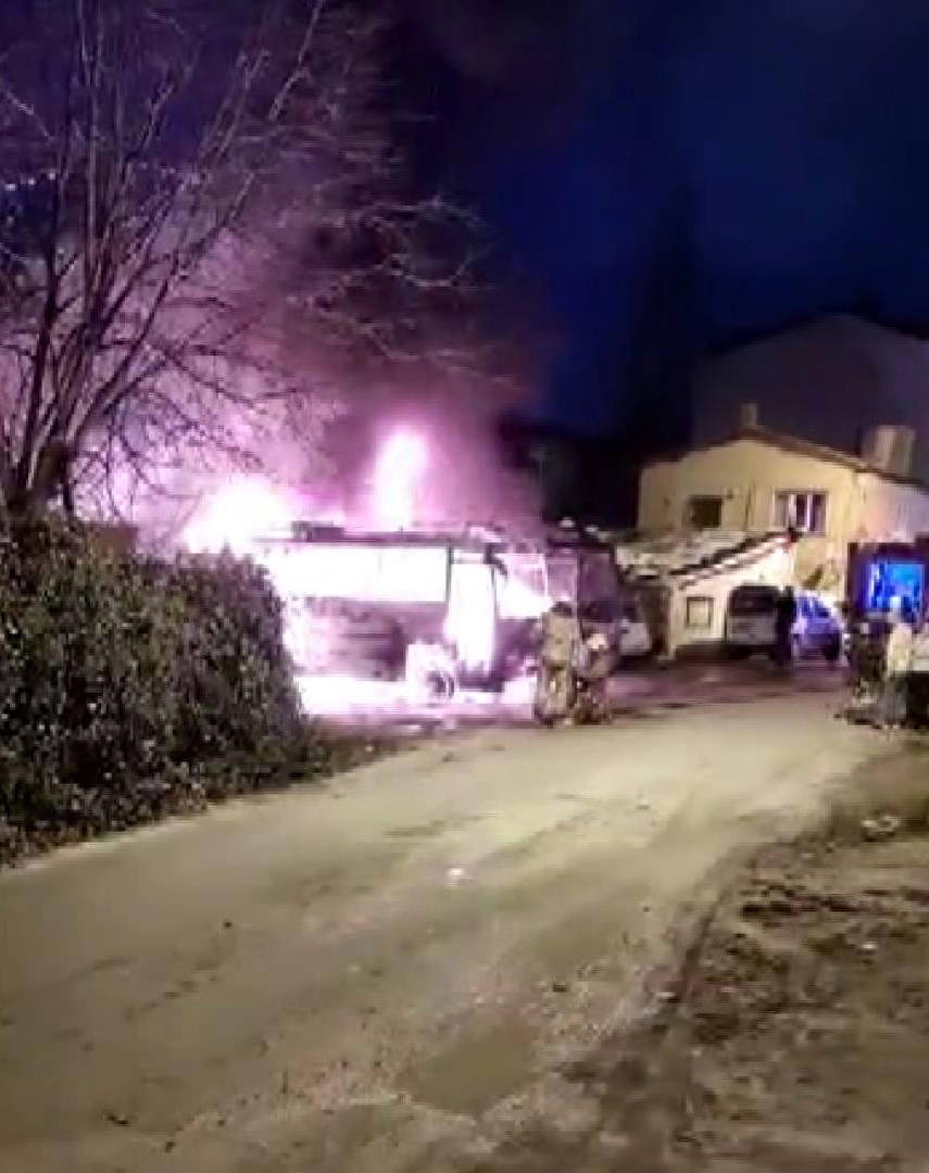 Halkalı Mahallesi Yeşilyurt Sokak'ta, saat 03.00 sıralarında henüz bilinmeyen bir sebepten dolayı park halinde bulunan 2 midibüs aynı anda alev alarak yanmaya başladı.
