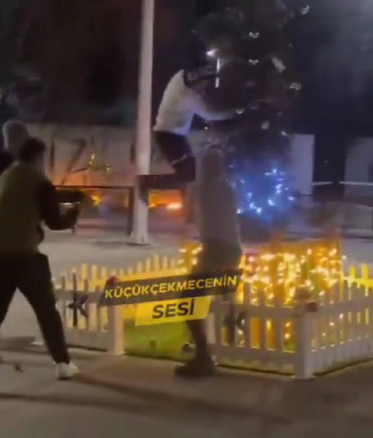 Küçükçekmece Belediyesi tarafından süslenen yılbaşı ağacı, yüzleri kapalı kişiler tarafından baltalı saldırıya uğradı.
