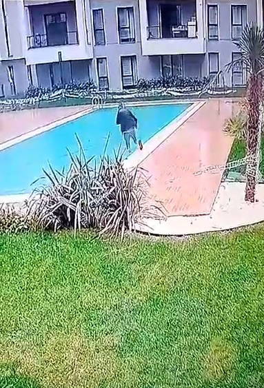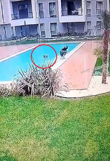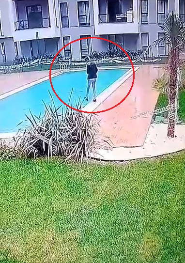Görüntülerde kuryenin dalgın bir halde yürüdüğü, havuza düştüğü ve havuzdan çıkmak için çırpındığı görülüyor.