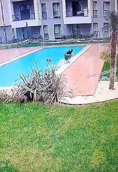 Kuryenin havuza düştüğü anlar sitenin güvenlik kamerasına yansıdı.