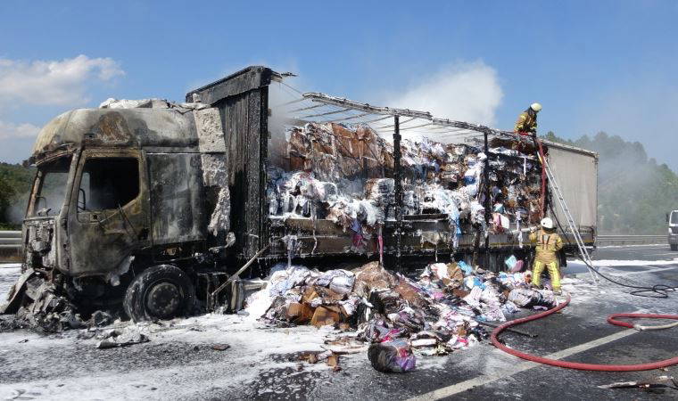 Tır sürücüsü Furkan Kural, “Yalova’ya gemiye gidiyordum yolda birden motor kısmında alevler çıkmaya başladı. Aşağıya indim frenleri çektim emniyete aldım etraftaki arkadaşlar yangın tüpü getirdi söndürmeye çalıştık. Bir anda alev aldı zor kurtardım kendimi” dedi.