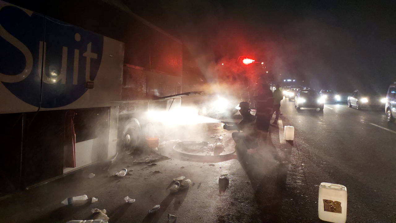 İddiaya göre, otobüs sürücüsü patlayan lastiğe rağmen, 2 kilometre uzaklıktaki dinlenme tesisine gidebilmek için yoluna devam etti. Bu sırada lastik alev aldı. Alevler, otobüse sıçradı. Sürücü, otobüsü emniyet şeridine çekip, yolcuların araçtan inmesini sağladı.