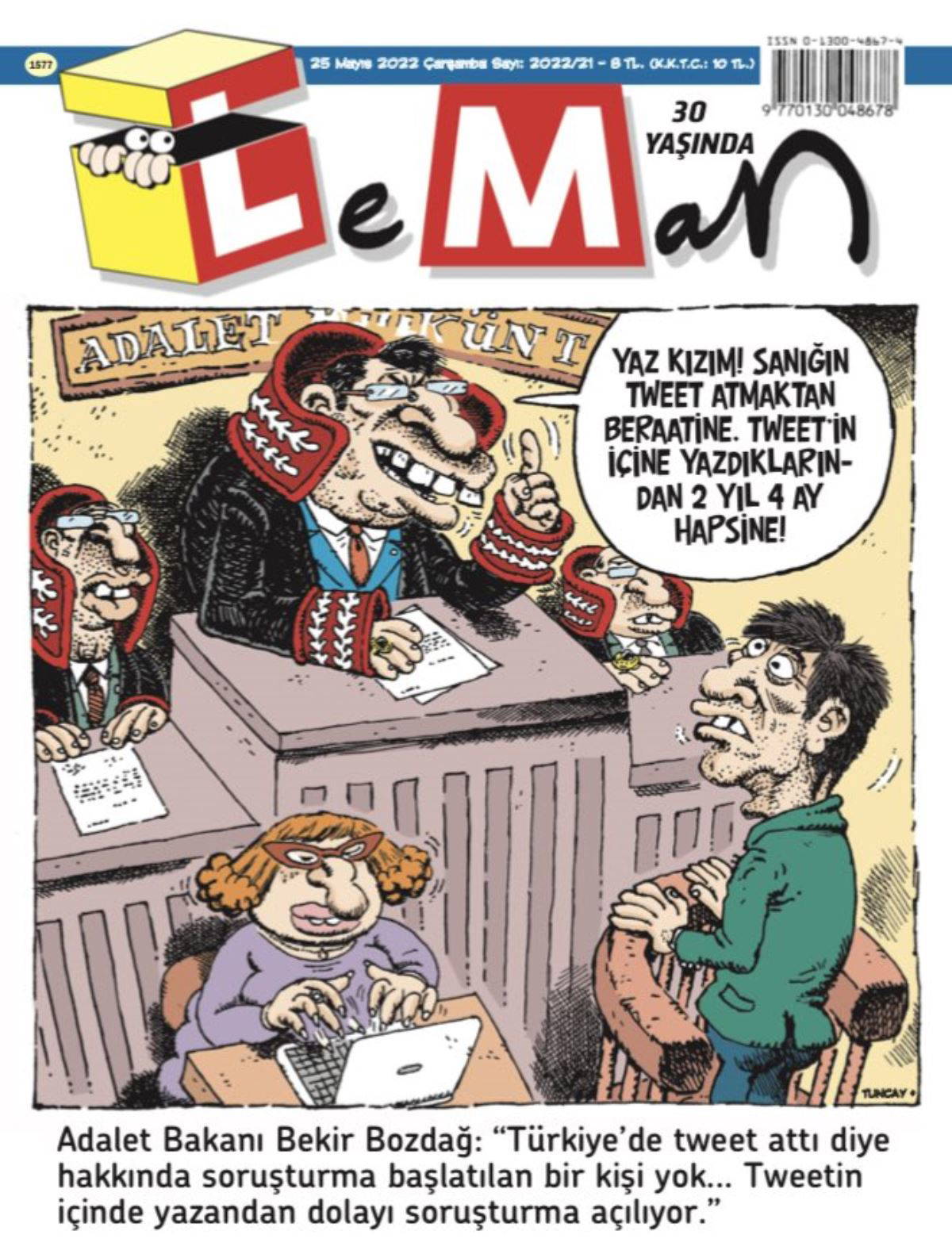 Derginin kapağında, mahkeme önüne çıkarılan bir sanığa hakimin "Yaz kızım. Sanığın tweet atmaktan beraatine. Tweet'in içine yazdıklarından 2 yıl 4 ay hapsine" demesi yer aldı.