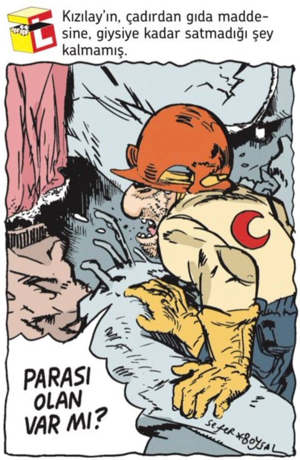 "Maalesef" notuyla paylaşılan kapakta, enkaz altında hayatta olan biri olup olmadığını anlamak için sorulan “Sesimi duyan var mı” sorusuna “Parası olan var mı?” ifadeleri ile gönderme yapıldı.