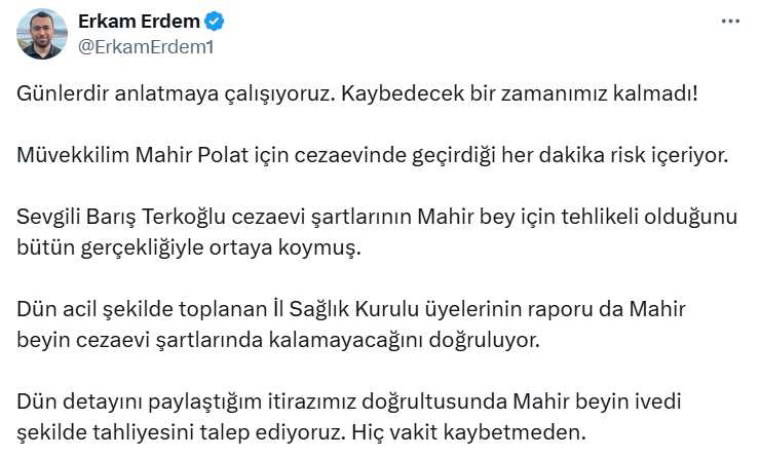 Avukat Erkam Erdem, "Günlerdir anlatmaya çalışıyoruz. Kaybedecek bir zamanımız kalmadı! Müvekkilim Mahir Polat için cezaevinde geçirdiği her dakika risk içeriyor" ifadelerini kullandı.