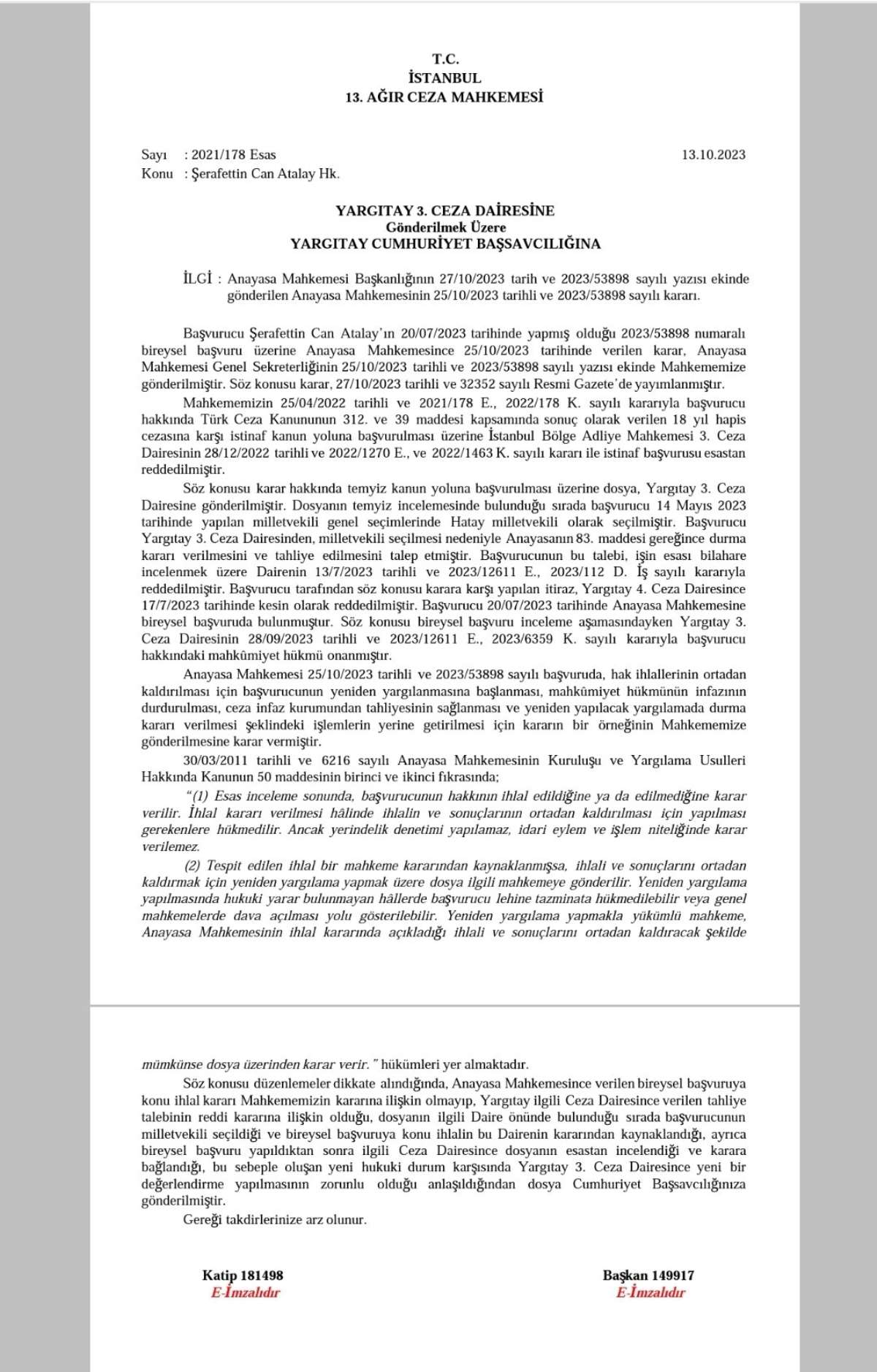 “Başvurucu Şerafettin Can Atalay’ın 20/07/2023 tarihinde yapmış olduğu 2023/53898 numaralı bireysel başvuru üzerine Anayasa Mahkemesince 25/10/2023 tarihinde verilen karar, Anayasa Mahkemesi Genel Sekreterliğinin 25/10/2023 tarihli ve 2023/53898 sayılı yazısı ekinde Mahkememize gönderilmiştir. Söz konusu karar, 27/10/2023 tarihli ve 32352 sayılı Resmi Gazete’de yayımlanmıştır.