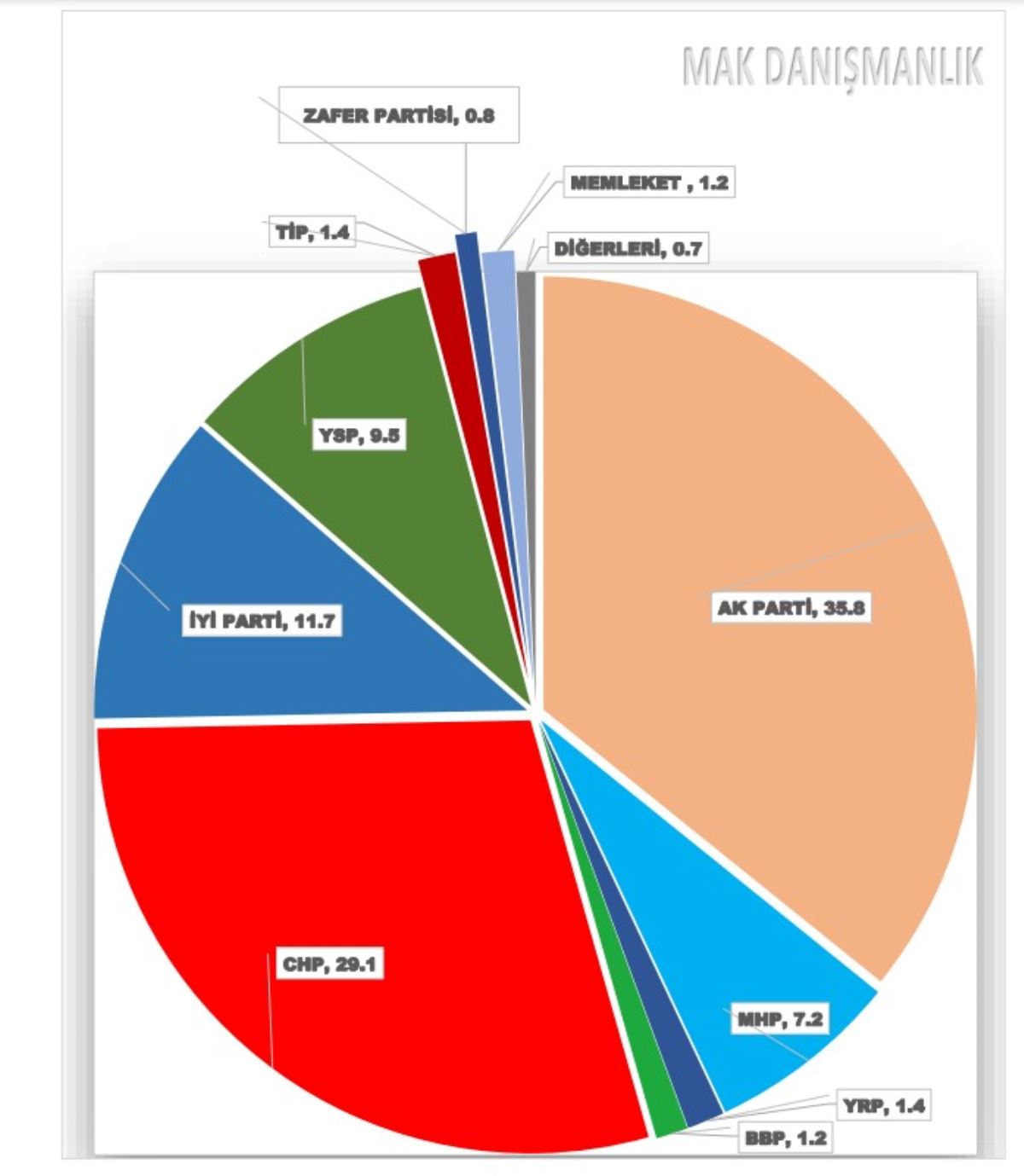 Ankette katılımcılara, "Yarın genel seçim (Milletvekilliği seçimi) olsa oyunuzu hangi siyasi partiye verirsiniz" sorusu yöneltildi. Kararsızlar dağıtıldıktan sonra oy oranları şöyle oldu: