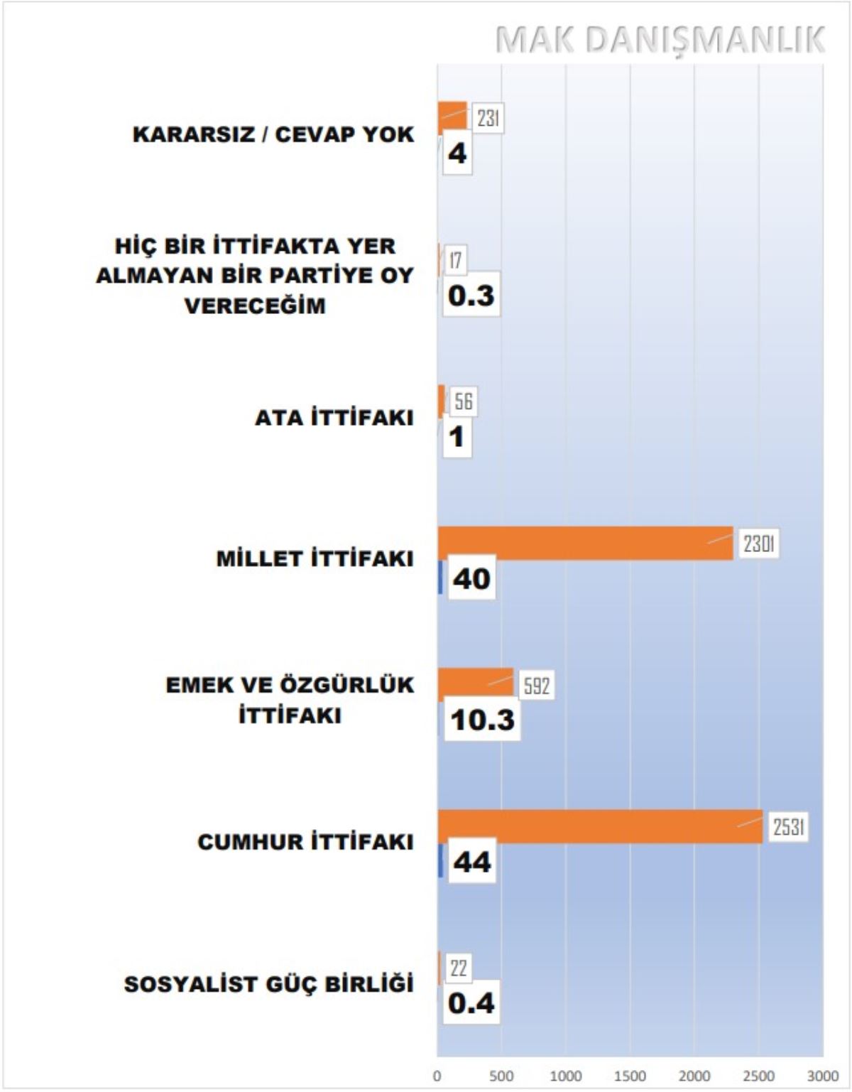 "14 Mayıs seçiminde oyunuzu hangi ittifaktan yana kullanacaksınız?" sorusuna "Cumhur İttifakı" diyenlerin oranı yüzde 44, Millet İttifakı diyenler ise yüzde 40 oldu. Diğer ittifakların oy oranı şu şekilde: