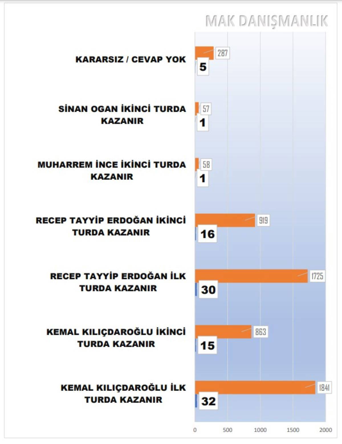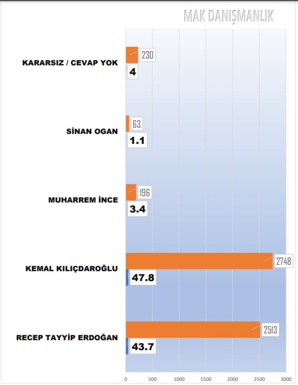 "14 Mayıs 2023'de yapılacak Cumhurbaşkanlığı Seçimi'nde hangi cumhurbaşkanı adayına oy vereceksiniz?" sorusuna Millet İttifakı Cumhurbaşkanı adayı Kemal Kılıçdaroğlu diyenlerin oranı yüzde 47.8, Cumhurbaşkanı ve AKP Genel Başkanı Recep Tayyip Erdoğan diyenlerin oranı ise 43.7 oldu. Muharrem İnce yüzde 3.4, Sinan Oğan yüzde 1.1 oy oranı aldı.